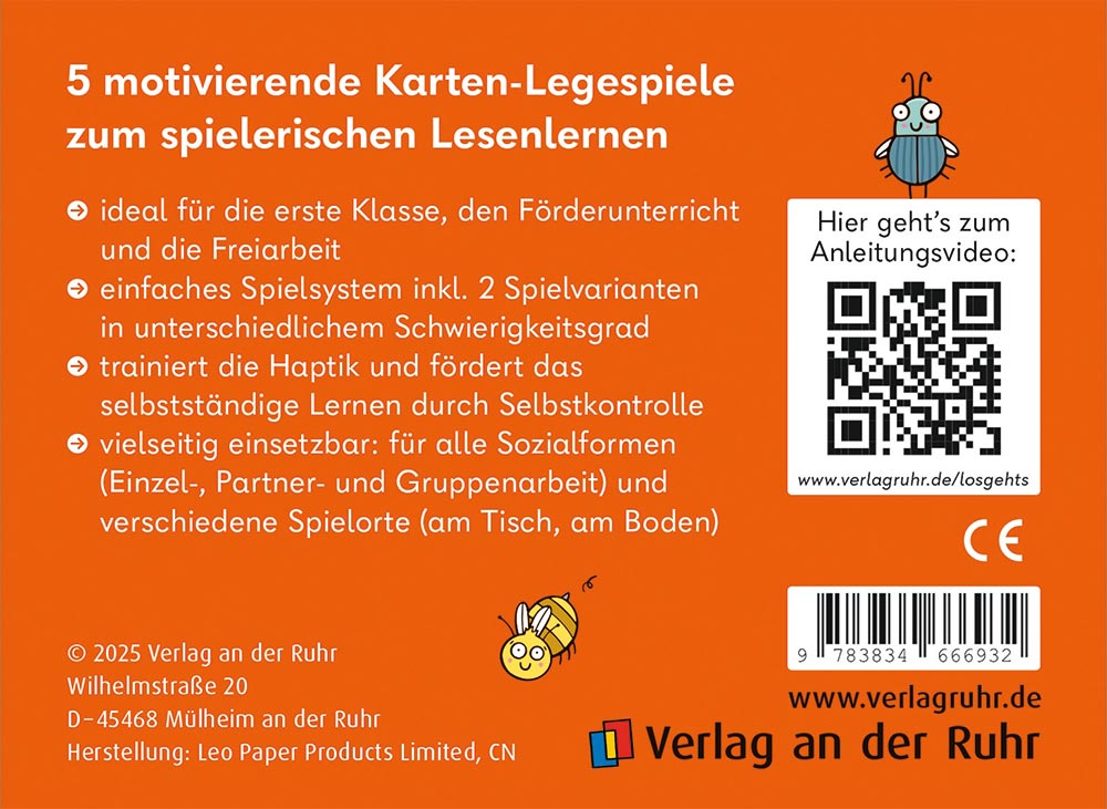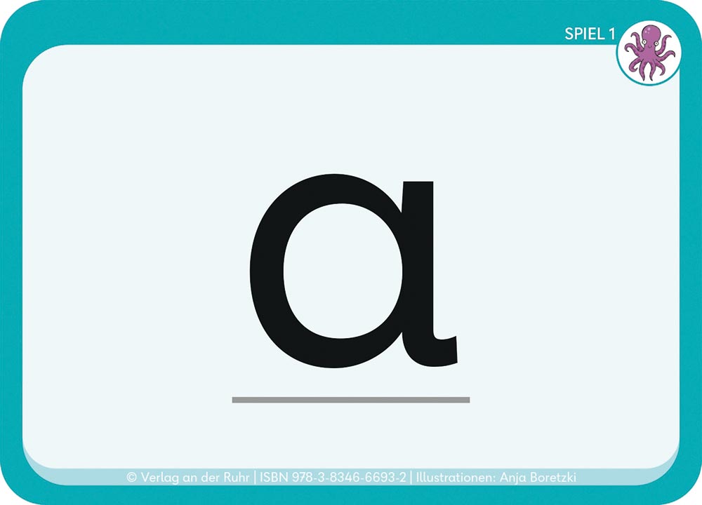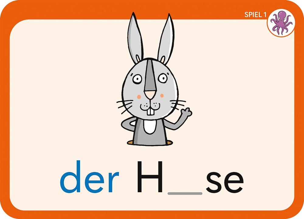Fünf Spiele zu Lauten, Silben und Wörtern mit zwei Spielvarianten. Eine beliebige Karte als Startkarte umdrehen, schnell die passende Lösungskarte suchen und umgedreht auf die Startkarte legen. Die zweite umgedrehte Karte auf dem Stapel zeigt die nächste Aufgabe an. So werden alle Karten nacheinander zugeordnet und gestapelt.