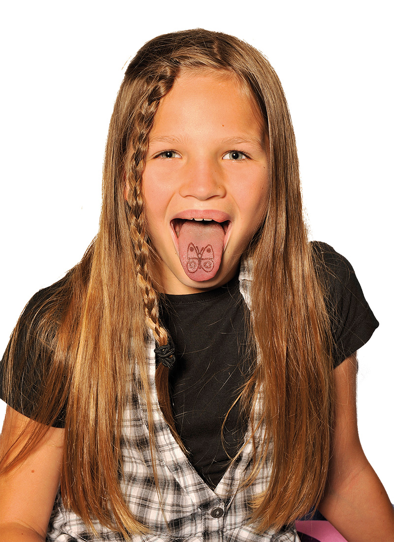 Witzige und essbare „Tattoos“ für die Zunge: Auflegen, kurz andrücken, wegnehmen, fertig. Anschließend die süßen Ess-Oblaten einfach auffuttern.
