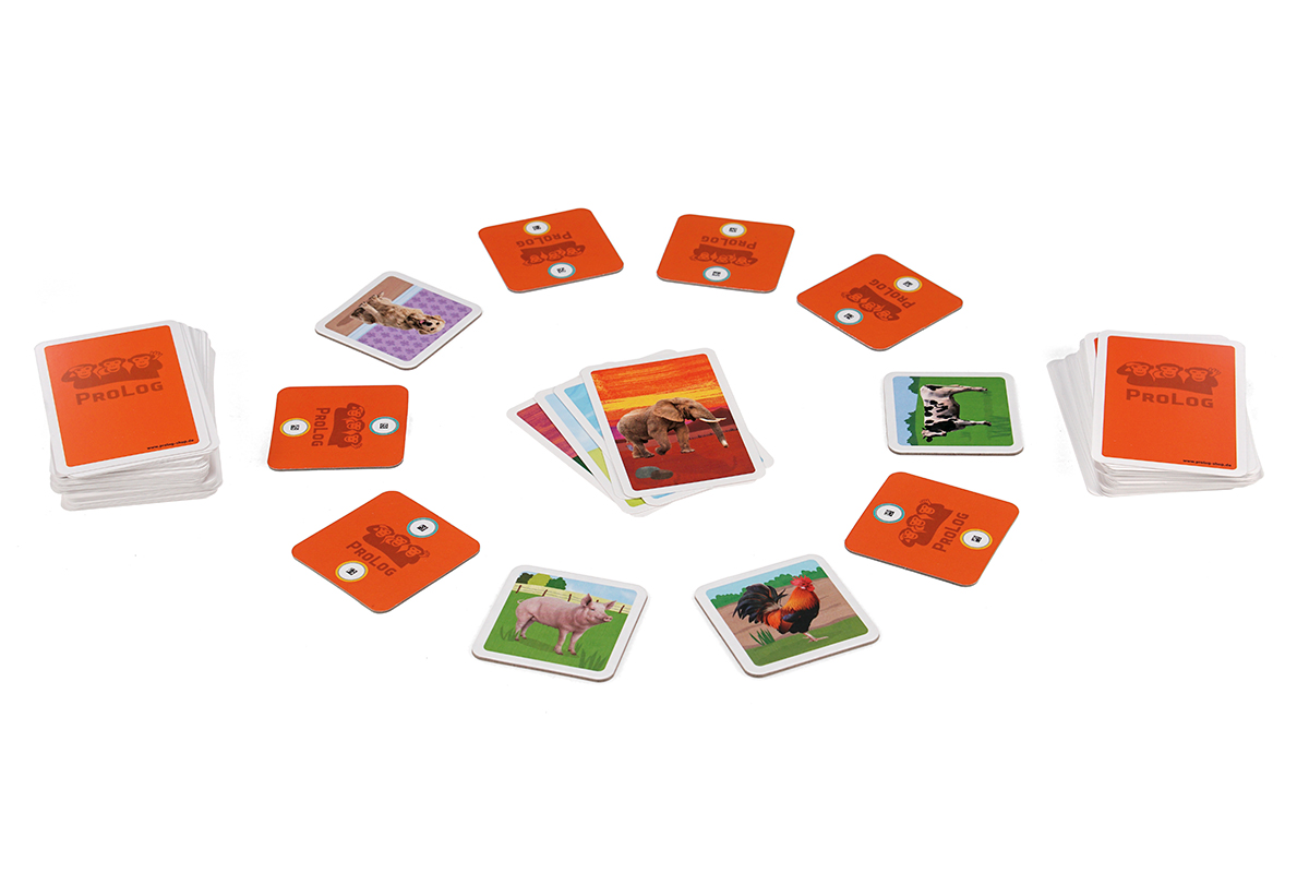10 quadratische Tierkarten, 110 Spielkarten, Anleitung