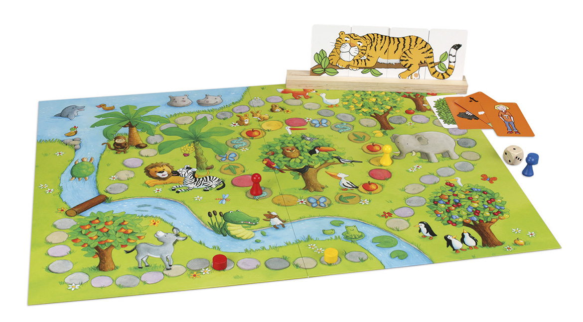 A2-großer Spielplan, Würfel, 3 Spielfiguren, 3 Spielsteine, 1 Kartenhalter, in großer Schachtel mit Sortierfächern UND einem Themen-Modul Ihrer Wahl