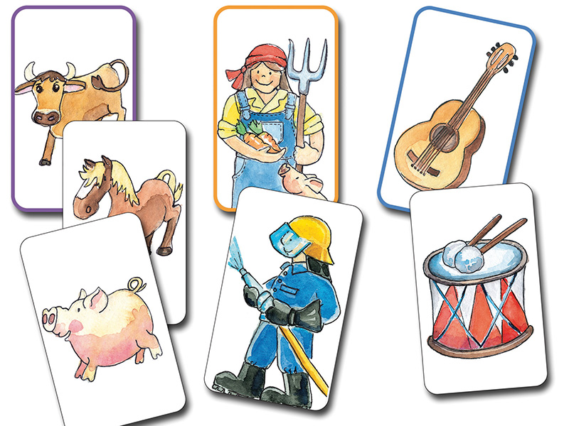Ein Ablegespiel zum spielerischen Erarbeiten der semantischen Kategorien Fahrzeuge, Spielzeug, Kleidung, Möbel, Bauernhoftiere, wilde Tiere, Obst und Berufe.