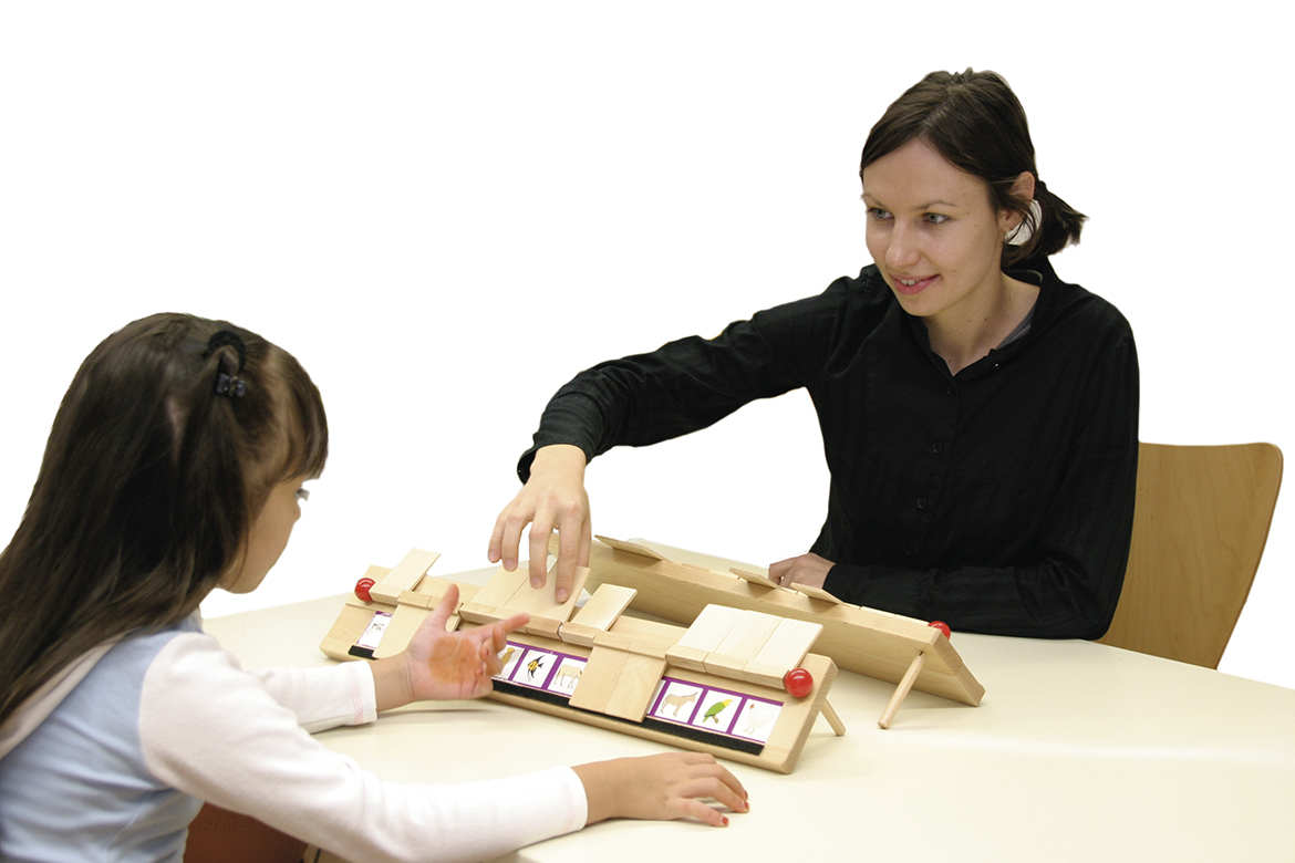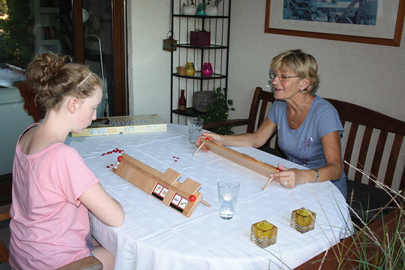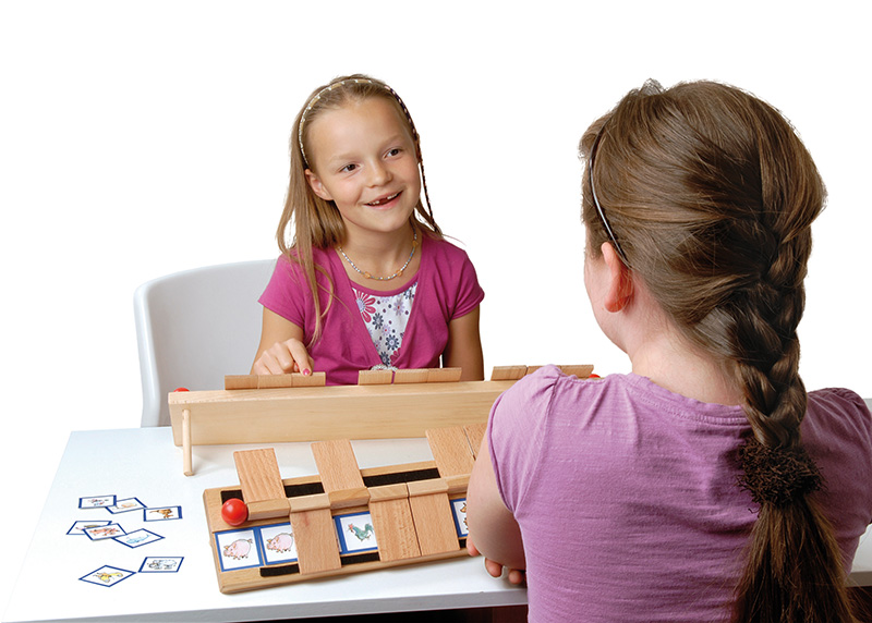 Hier zählt genaues und strategisch geschicktes Fragen! "Klappt genau" ist ein rasantes Spiel zum wechselseitigen Erfragen einer Bildkarte. Zwei Spieler haben dazu in je ein Holz-Spielgerät eine Vorlage mit zwölf bildlich dargestellten, themensortierten Begriffen eingelegt. Nun gilt es, den vom Mitspieler ausgewählten Zielbegriff durch geschicktes Fragen zu erraten, indem nach übergeordneten Merkmalen gefragt wird. Wegfallende Bildkarten werden "weggeklappt", bis die gesuchte Karte übrig bleibt. Frage-Beispiele: Ist es ein Nachtisch? Ziehen Mädchen es an? Hat das Tier vier Beine? Kann es fliegen?