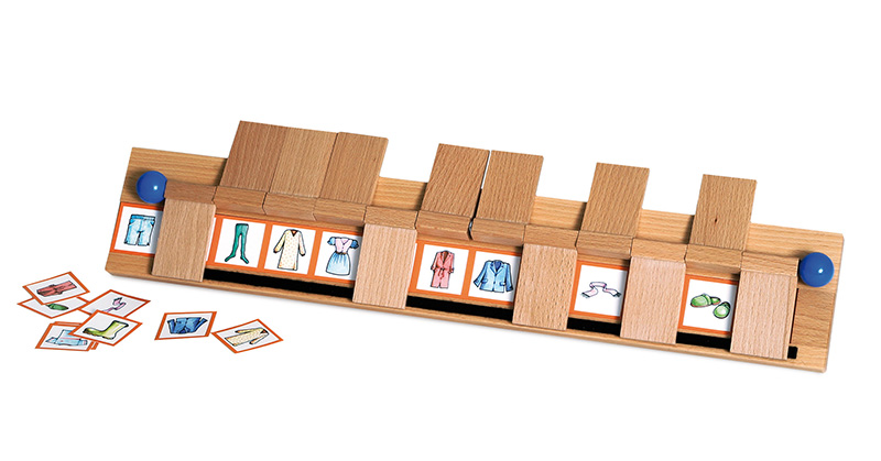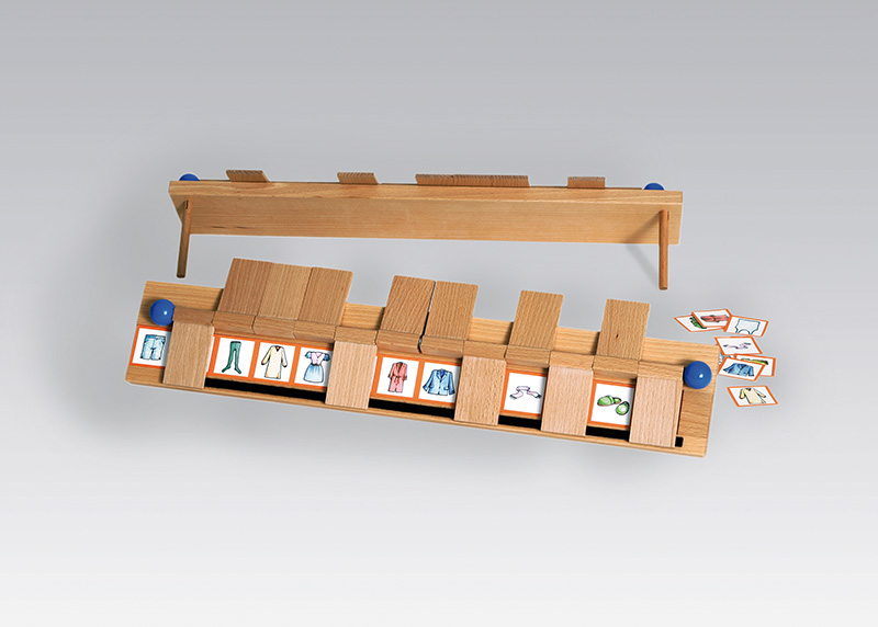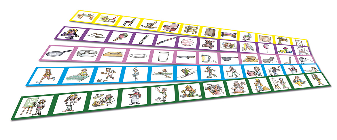 Basispaket mit 2 Holzständern, 9 Streifen (gesamt 27 Streifen: jeder Streifen liegt doppelt vor und ein drittes Mal zum Ausschneiden in kleine Kärtchen vor) mit je 12 Motiven zu den Themengebieten: Musikinstrumente, Essen, Kleidung, Tiere, Haushalts- und Küchenzubehör, Spielsachen, Berufe, Freizeitbeschäftigungen und Möbel, im Karton