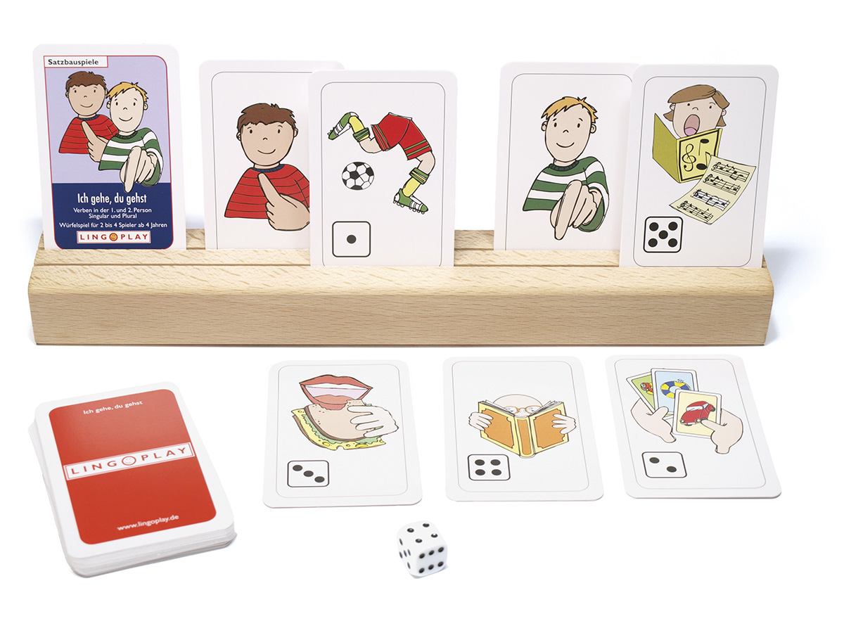 Das Würfelspiel "Ich gehe, du gehst" fokussiert die Beugung der Verben in der 1. und 2. Person Singular und Plural und regt mit seinen 16 Verbkarten und je 8 Ich-, Du-, Wir- und Ihr-Figurenkarten die Spieler zum Bilden von Sätzen mit Personalpronomina an. Die Spieler würfeln reihum und decken eine Figurenkarte auf, die eine Verbkarte bedeckt. Stößt der Spieler auf eine Ich-Figur, formuliert er einen Satz mit "Ich", wie z. B. "Ich esse." Er darf die Karte behalten und noch einmal würfeln. Deckt er eine Du-Figur auf, bildet er den Satz mit "Du", wie z. B. "Du isst." In diesem Fall erhält der Spieler rechts neben ihm die Karte und darf als nächster würfeln. Sind alle Verbkarten aufgedeckt, ist das Spiel beendet und der Spieler mit den meisten Figurenkarten hat gewonnen. Mit den Wir- und Ihr-Figurenkarten wird analog gespielt.
