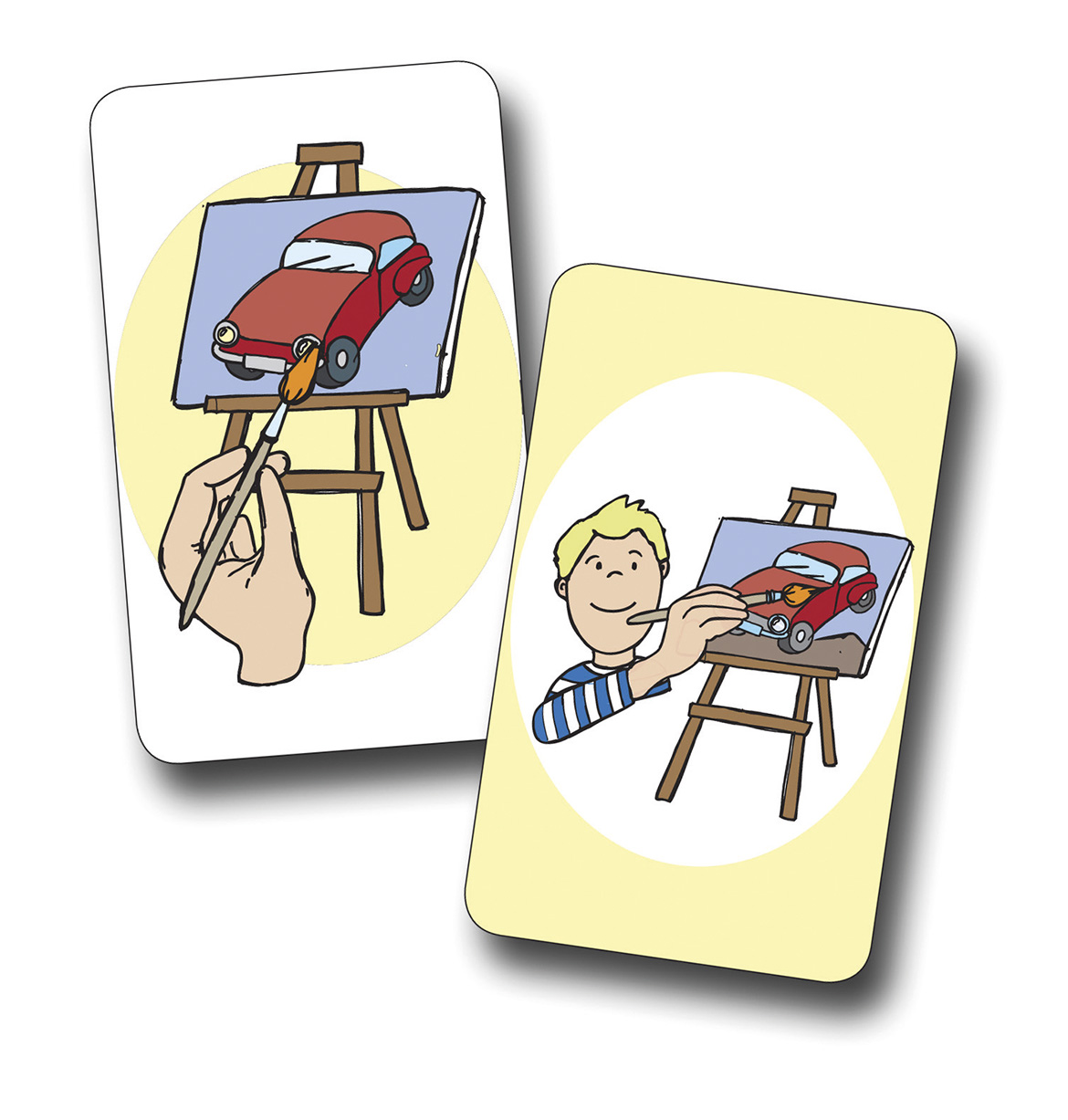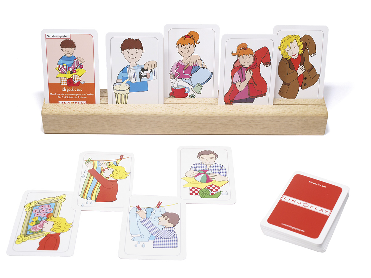 So vermittelt das Merkspiel "Eis Essen - Lisa isst Eis" anhand von 16 Minimalpaaren, wie sich Verben in der Grundform zur Personalform verändern, also flektiert werden, wenn ein Subjekt hinzukommt. Die eine Karte zeigt jeweils eine Tätigkeit an einem Objekt ohne Figur, wie z. B. Ball spielen oder Zeitung lesen, und die andere Karte zeigt eine Figur, die die Tätigkeit am Objekt ausübt, wie z. B. der Junge spielt Ball oder der Mann liest Zeitung. Der Spieler, der am Zug ist, dreht eine der verdeckt liegenden Karten um und beschreibt die darauf abgebildete Tätigkeit, wie z.B. "Eis essen". Dann sucht er die passende Figurenkarte unter den offen daliegenden Karten heraus, legt die gezogene an die gefundene Karte an und beschreibt wer die Tätigkeit ausübt, wie z.B. "Das Mädchen isst Eis!" Sind alle Karten eines Spielers abgedeckt, hat dieser gewonnen und das Spiel ist beendet.