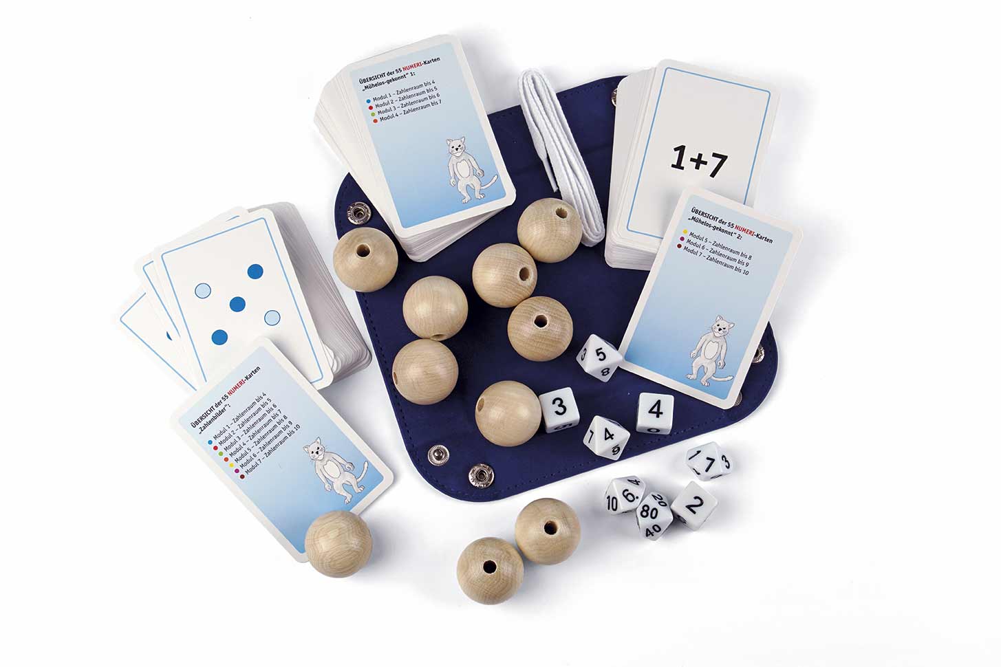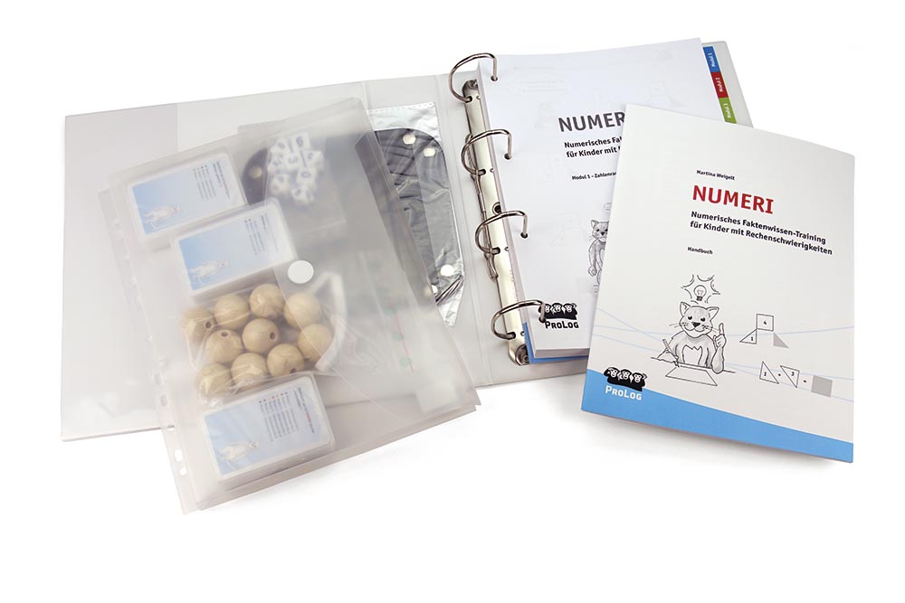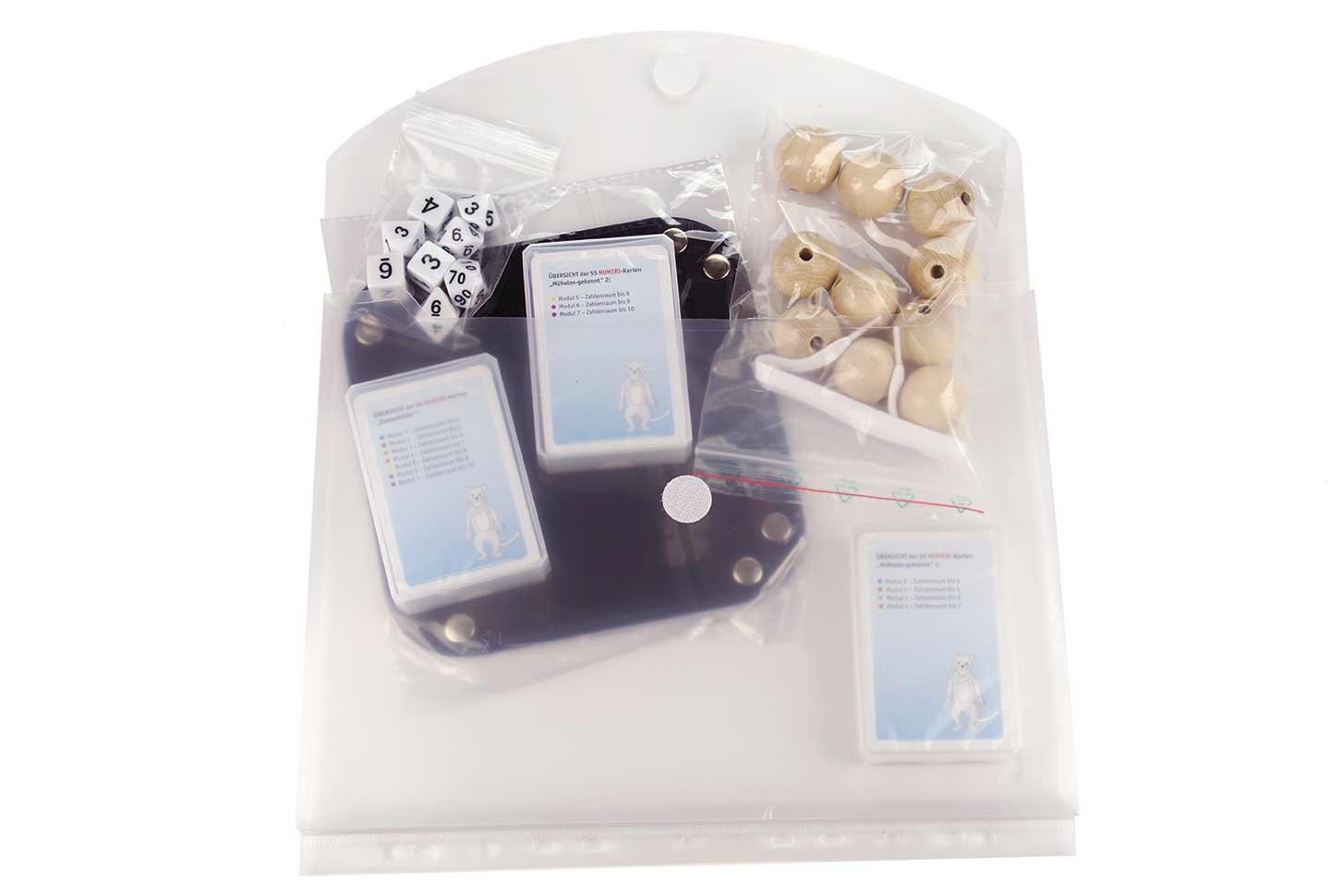 Ordner mit Handbuch (24. S.) und Arbeitsblättern (147 Seiten), Kugelkette mit 10 Holzkugeln, drei Kartensätze und 8 Würfel, faltbares Würfelbrett