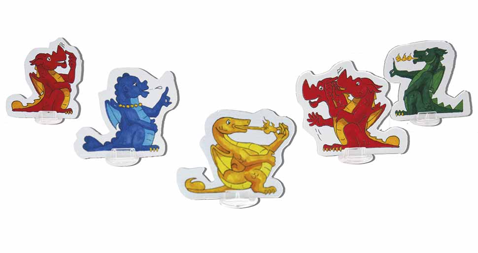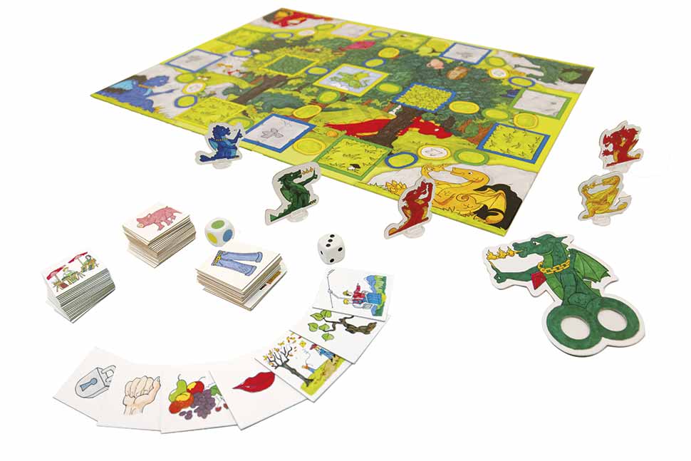 großer Spielplan, 5 Spielfiguren, Farb- und 3er-Würfel, Drachen-Fingerpuppe, Spielanleitung, 141 Karten, im Spielekarton