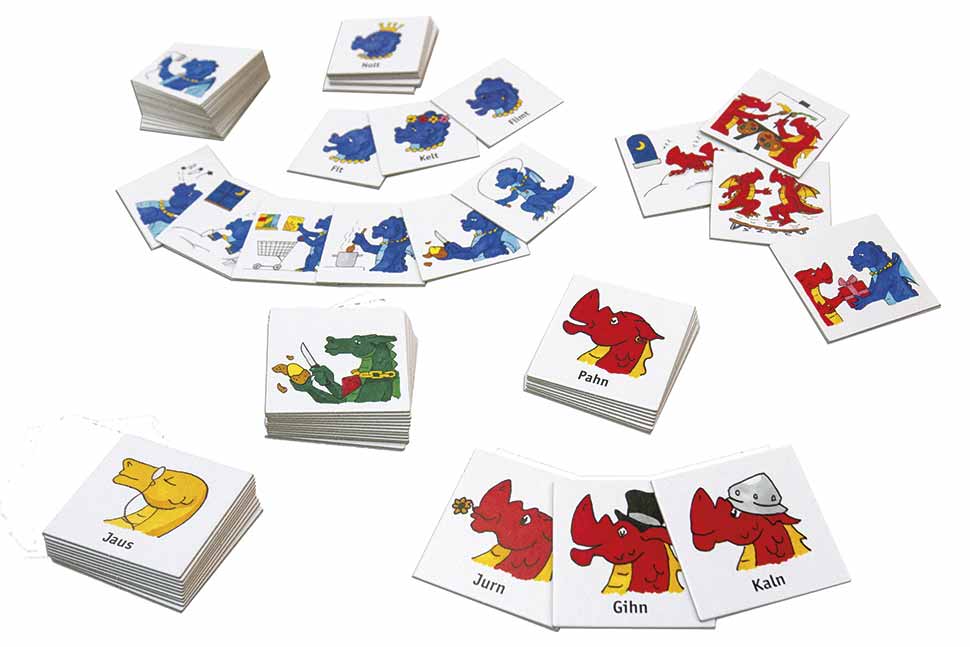 Dabei ist die Schulung der auditiven Differenzierung und artikulatorischen Umsetzung dieser Laute ein Übungsbereich, der mit Fantasiewörtern (Drachennamen) und bildlich dargestellten Nomen untermalt wird. Die lautspezifischen Merkmale werden dabei mithilfe von Lautgesten unterstützt und auch durch die Form von Kopf und Schwanzspitze der Drachen optisch aufgegriffen.