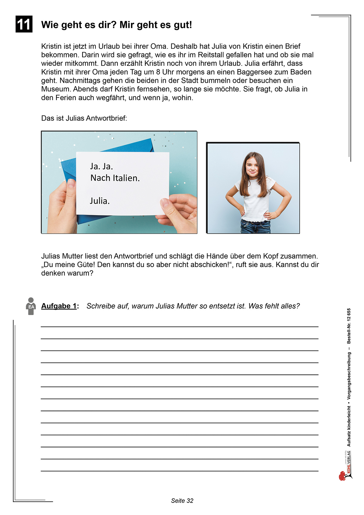 Die Vorgangsbeschreibung ist eine Anleitung für bestimmte Vorgänge, die so genau wie möglich beschrieben, ja dokumentiert werden. Jeder, der die Beschreibung liest, soll die Handlung leicht nachvollziehen und, je nach Situation, auch selbst nachmachen können. In diesem Heft wird den Schüler*innen das nötige Handwerk zum Erstellen einer richtigen Vorgangsbeschreibung vermittelt. Was muss ich beim Schreiben beachten? Zu welchen Themenbereichen eignen sich die Vorgangsbeschreibungen? Wie gehe ich Schritt für Schritt bei der Bearbeitung vor?