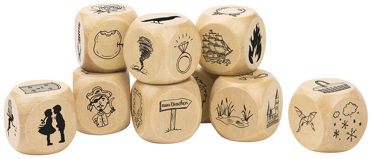 - Mit den gewürfelten Symbolen erzählt der*die Spieler*in eine eigene Geschichte.