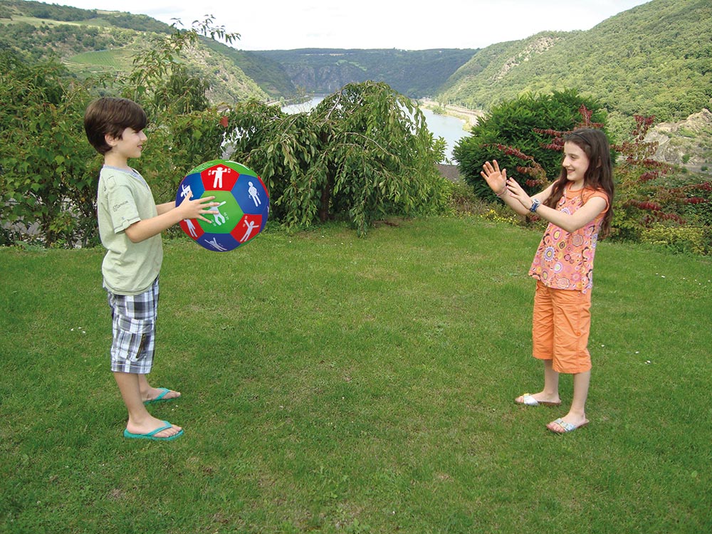 Spiel-Tipp: Die Kinder werfen sich den Ball gegenseitig zu. Beantwortet wird immer die Aufgabe, auf die beim Fangen der rechte Daumen zeigt. Beim ABC-Ball z.B. auf einen Buchstaben. Von diesem sind dann Wörter zu bilden, Stadt/Land/Fluss spielen usw.!