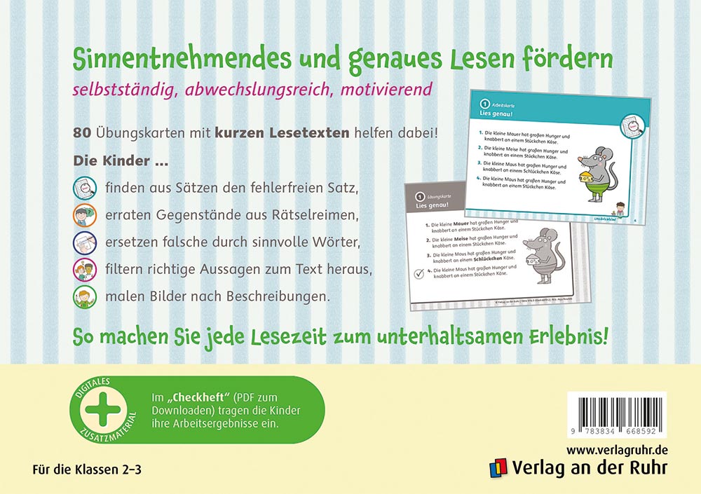 Auf den Karteikarten finden die Kinder neben kurzen Lesetexten ansprechende Übungsformate zur Sprach- und Bedeutungsanalyse, die sie nur erfüllen können, wenn sie genau gelesen haben.