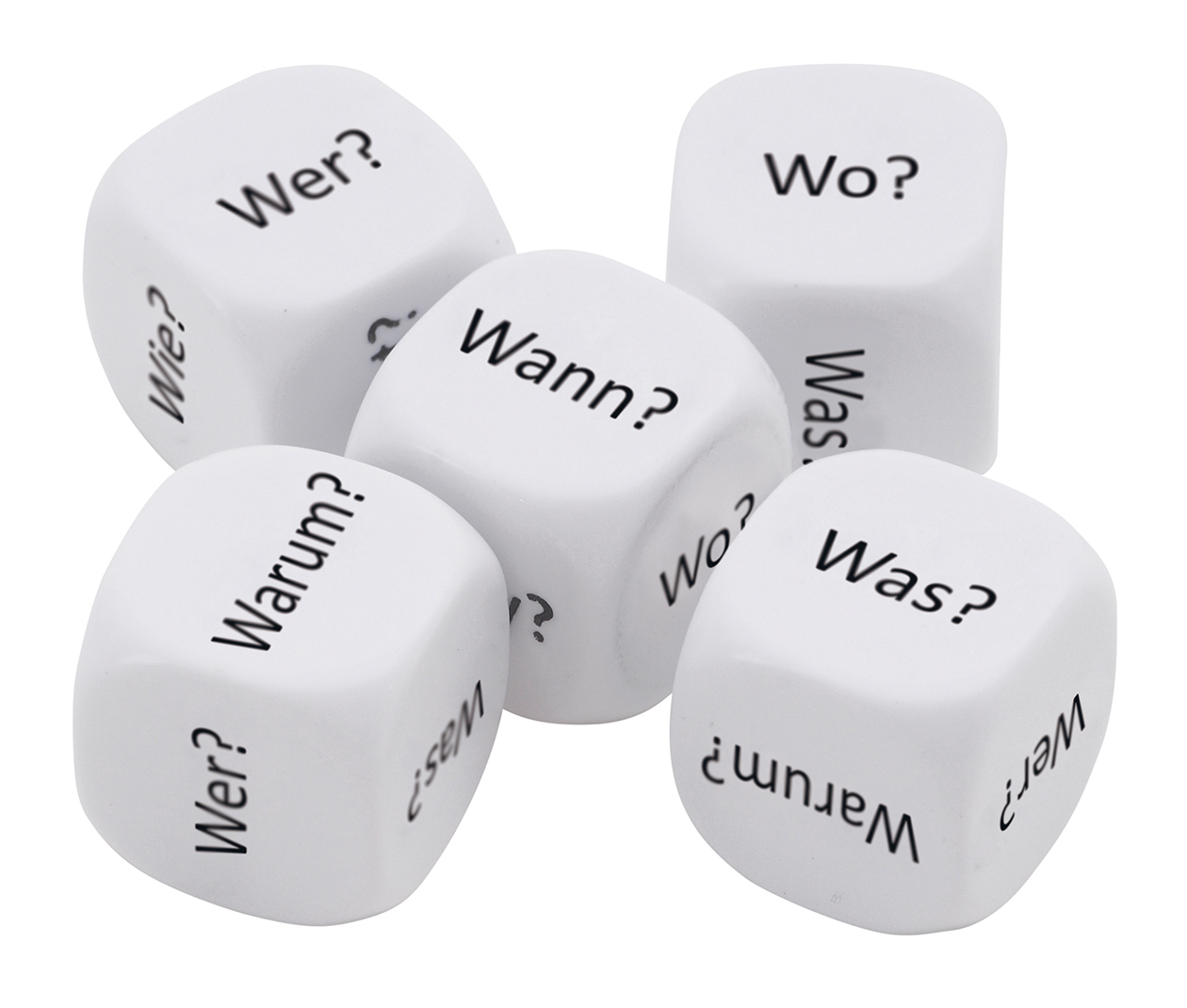 5 Würfel mit den deutschen Fragewörtern: Wer?, Wo?, Wann?, Warum?, Was?, Wie?