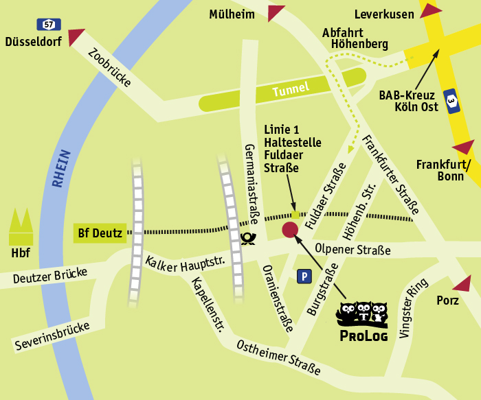 Am Bahnsteig den Hinweisen zur U-Bahn am Ende des östlichen Bahnsteigs folgen, zum Bahnsteig der Linie 1/Richtung Bensberg/Refrath oder Brück nach unten gehen, mit dieser dann vier Stationen bis zur Haltestelle Fuldaer Straße fahren, das U-Bahngebäude rechts verlassen und bis zur Kreuzung Olpener Straße gehen die Räume von ProLog liegen jetzt direkt rechts neben Ihnen.