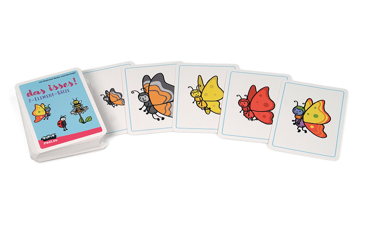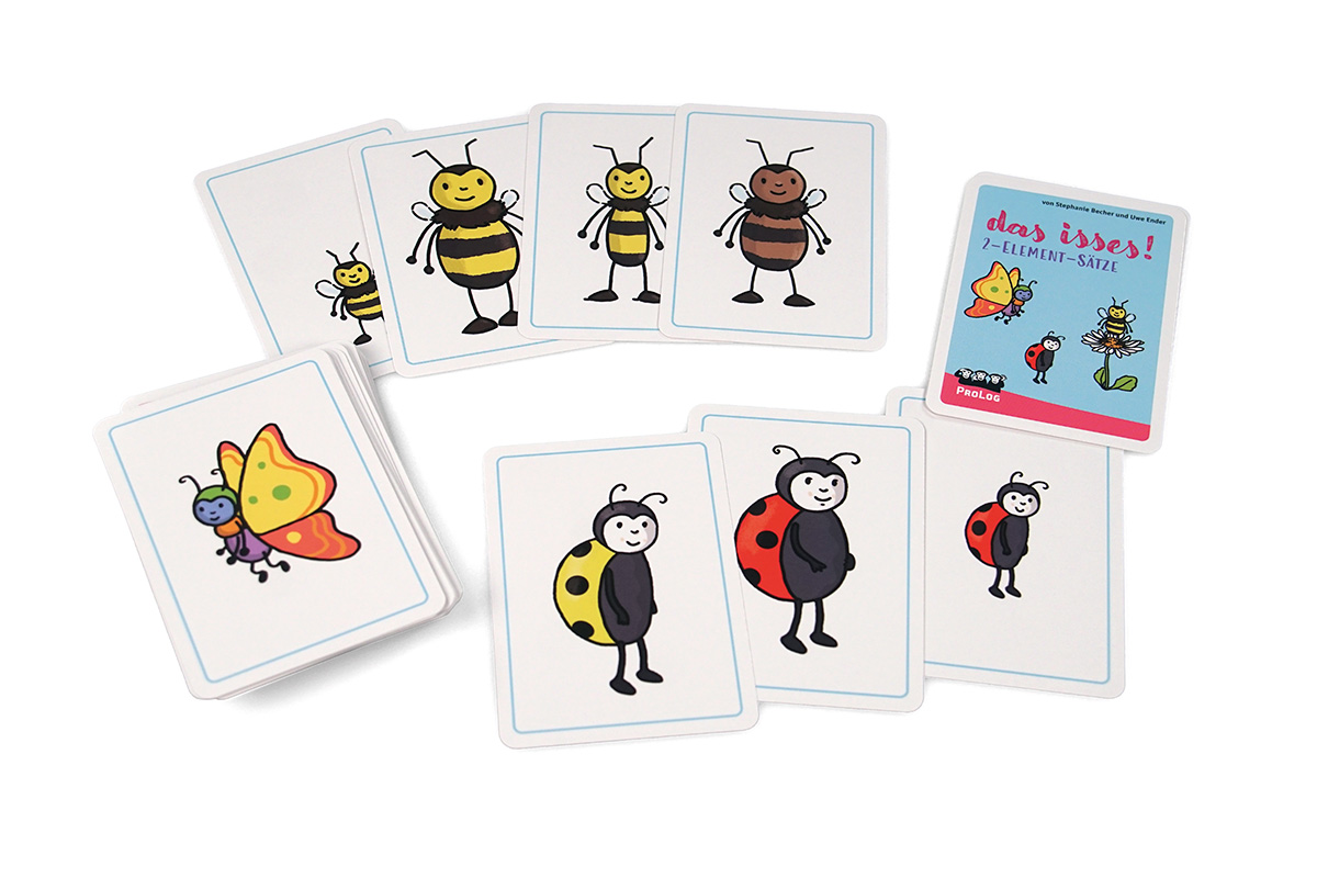 - 2-Element-Sätze -> Hier führen Insekten durchs Spiel. Das Spiel übt das Verstehen und Anwenden kurzer Satzstrukturen, bei denen zwei Elemente für die eindeutige Beschreibung notwendig sind: „Ist es die große Biene?“