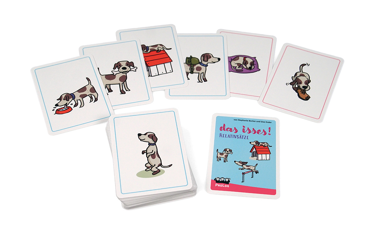- Relativsätze -> Hier führen Hunde durchs Spiel. Das Spiel trainiert das Verstehen und Ausdrücken des Bezugs zwischen Haupt- und Nebensatz, der in einem Relativsatz formuliert wird: „Ist es der Hund, der an der Leine zieht?“