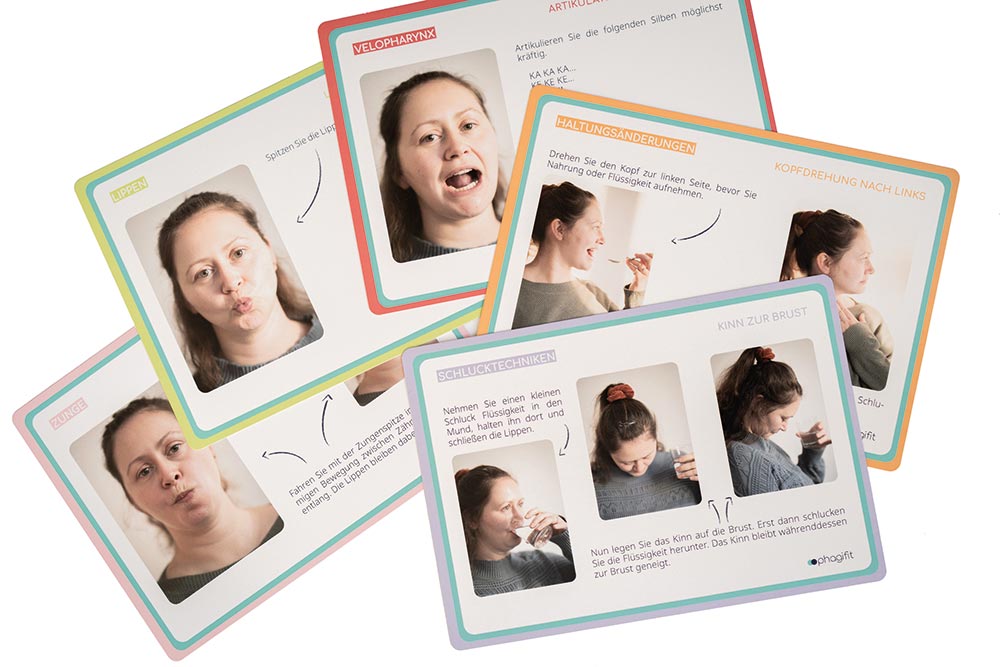 Für die Dysphagiebehandlung in der Präsenztherapie - auch im Hausbesuch - kann es angenehm sein, "etwas in der Hand zu haben". Der Übungskartensatz soll die stationäre und ambulante Dysphagietherapie unterstützen. Fotos und Begleittexte visualisieren Übungen aus den Bereichen Muskelkräftigung, Schlucktechniken und Haltungsveränderungen. Der Einsatz von Übungskarten ermöglicht eine klare Strukturierung und intensive Vermittlung der Therapieinhalte in der logopädischen Präsenztherapie. Eine visuelle und haptische Repräsentation der Übungsinhalte kann die Umsetzung erleichtern.