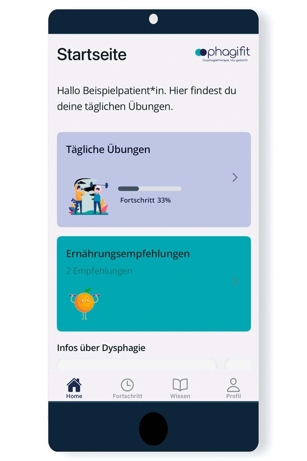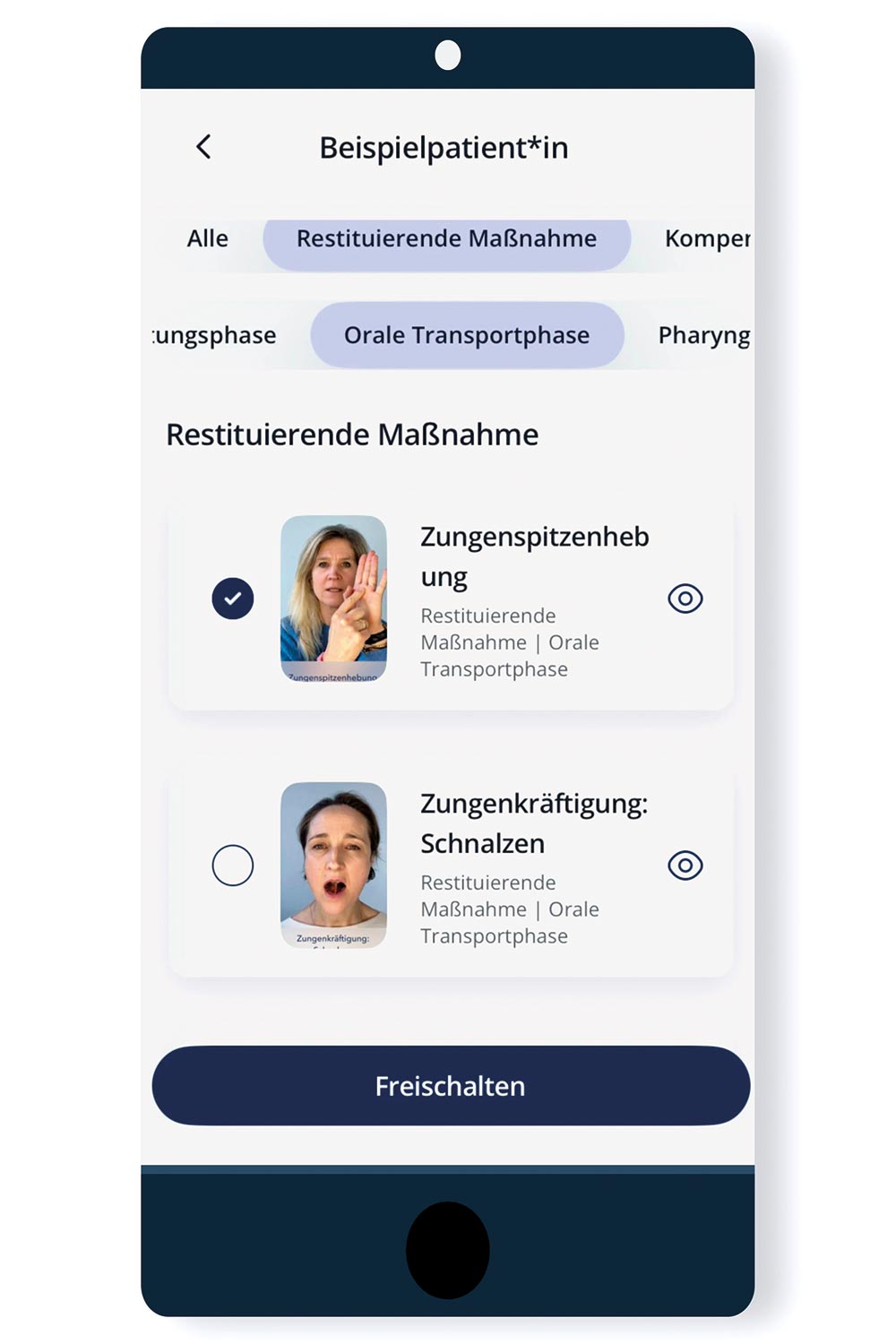 Individuell freischaltbare Übungsvideos (angelehnt an die Funktionelle Dysphagietherapie), diätetische Empfehlungen, digitaler „Schluckwecker" zur Förderung des Speichelmanagements, sowie Hintergrundinformationen dienen der Förderung des (häuslichen) neu Eigentrainings der Betroffenen.