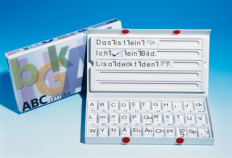 Der Deckel beinhaltet fünf Ablageschienen und dank der individuellen Breite der Buchstabenkärtchen ergibt sich ein harmonisches Schriftbild.