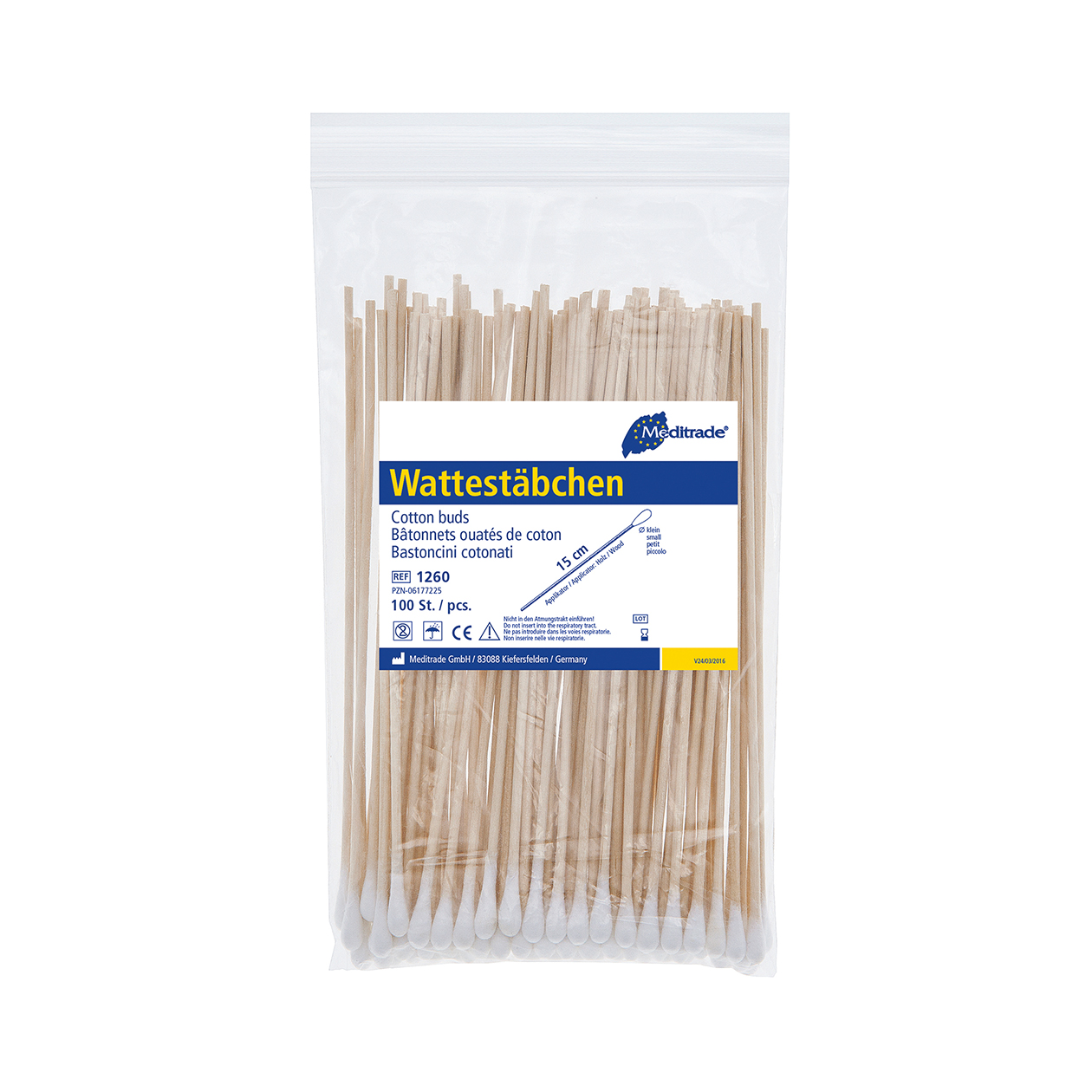Inhalt: 50 Wattestäbchen im Beutel; Holzstäbchen mit einseitigem Wattekopf, Länge 15 , unsteril
