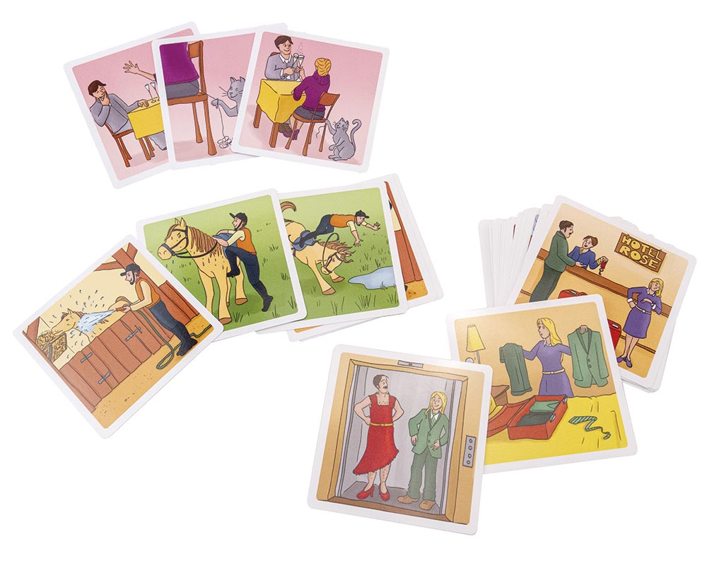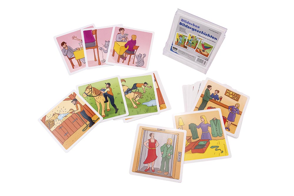 40 Karten (12,5 x 12,5 cm) mit 37 Bildern (3-6 Bilder pro Geschichte), mit Bildbeschreibungen
