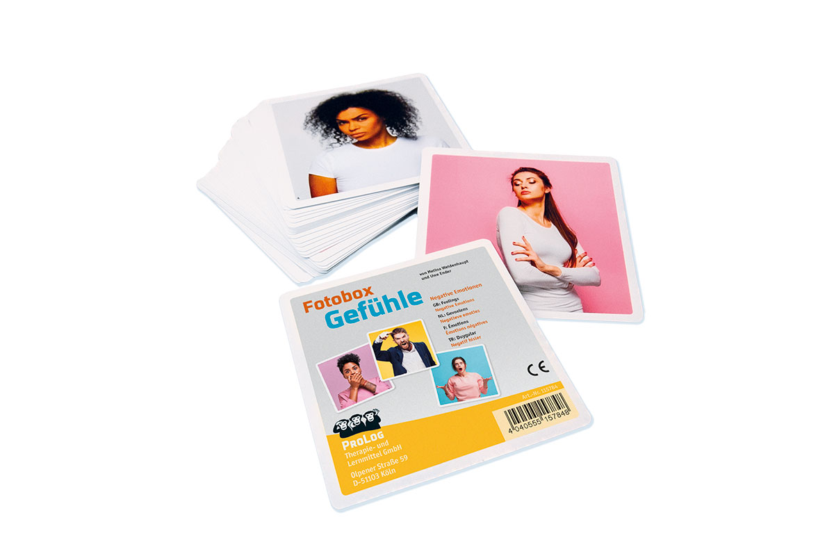 Über Gefühle sprechen, sie äußern und auch beim Gegenüber interpretieren zu können, ist ein wichtiges Element der alltäglichen Kommunikation. Die Fotoboxen Gefühle bieten die Möglichkeit, Abbildungen von Emotionen zum Beispiel in Übungen zum Wortabruf oder Umschreiben zu integrieren. Hierfür liegen Fotokarten mit 36 negativen Emotionen vor, die als Gesprächsanlass und zur visuellen Unterstützung genutzt werden können. Eine Liste aller enthaltenen positiven und negativen Gefühle ist hier einsehbar.