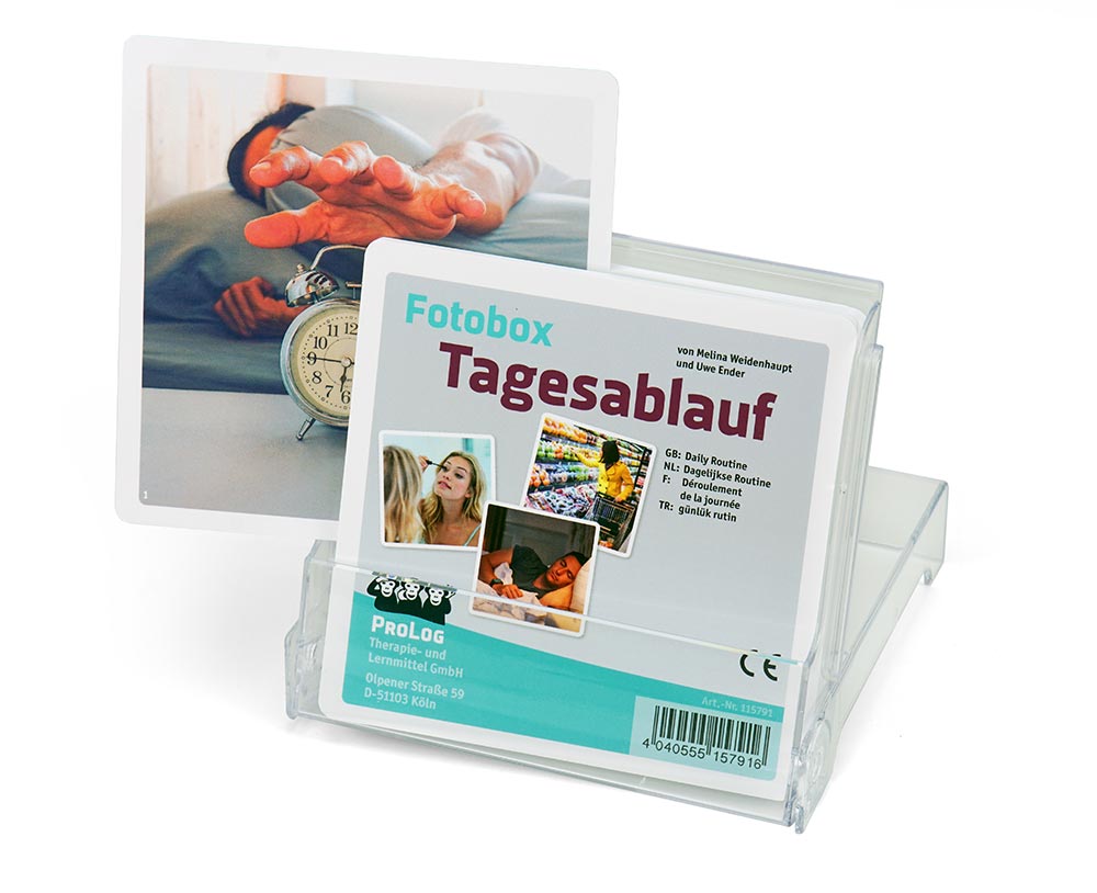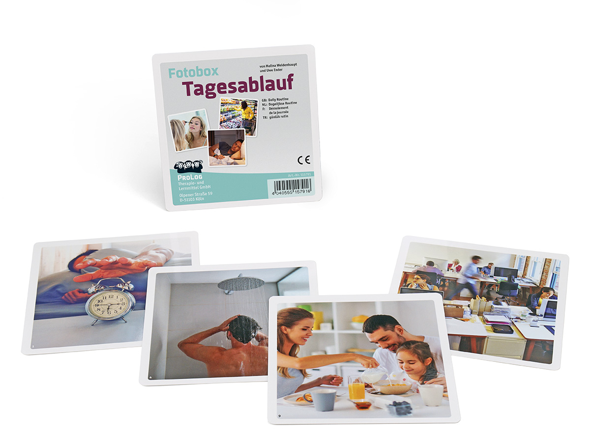 Die 36 farbigen Fotos dieser Box zeigen Handlungen und Aktionen des täglichen Lebens und bieten somit Material für Benennübungen und die Sortierung zeitlicher Tagesabfolgen im Rahmen der Aphasie- bzw. Wortschatztherapie.