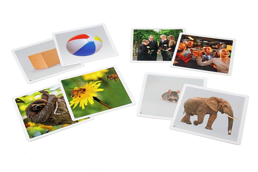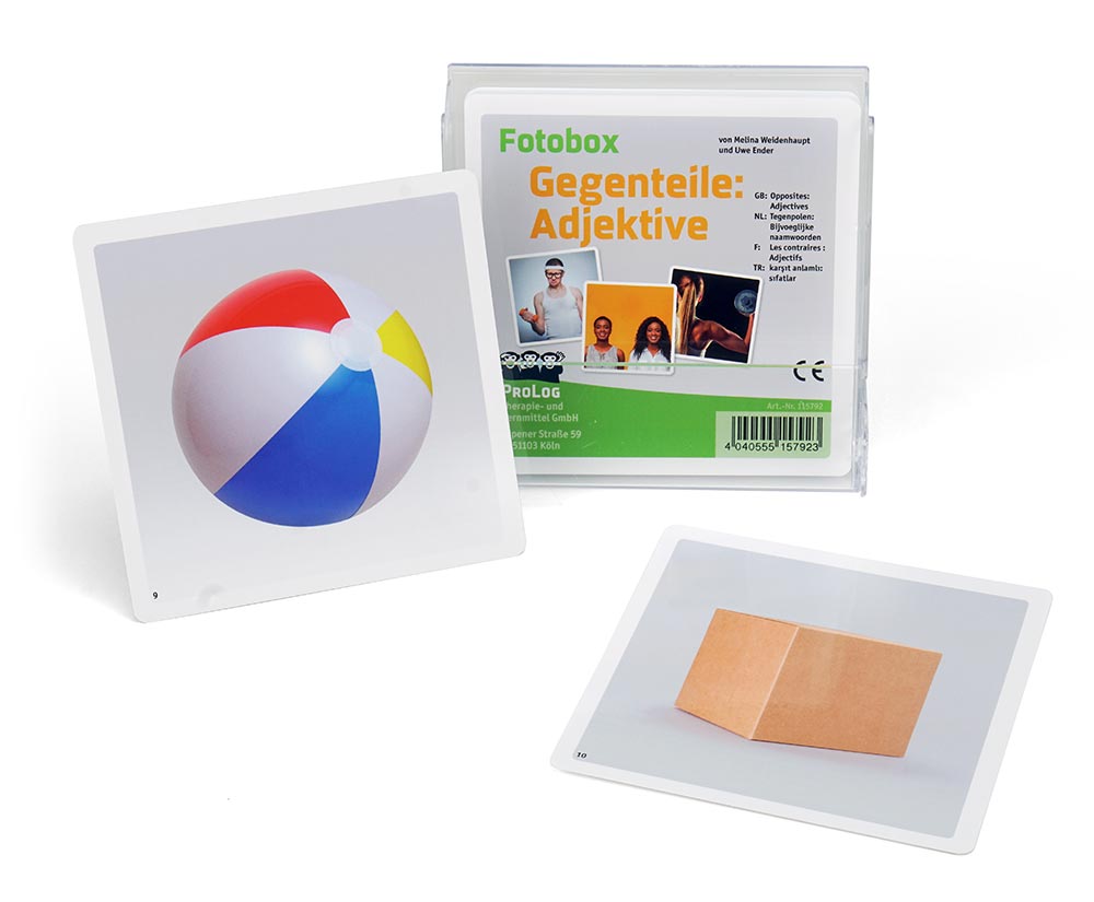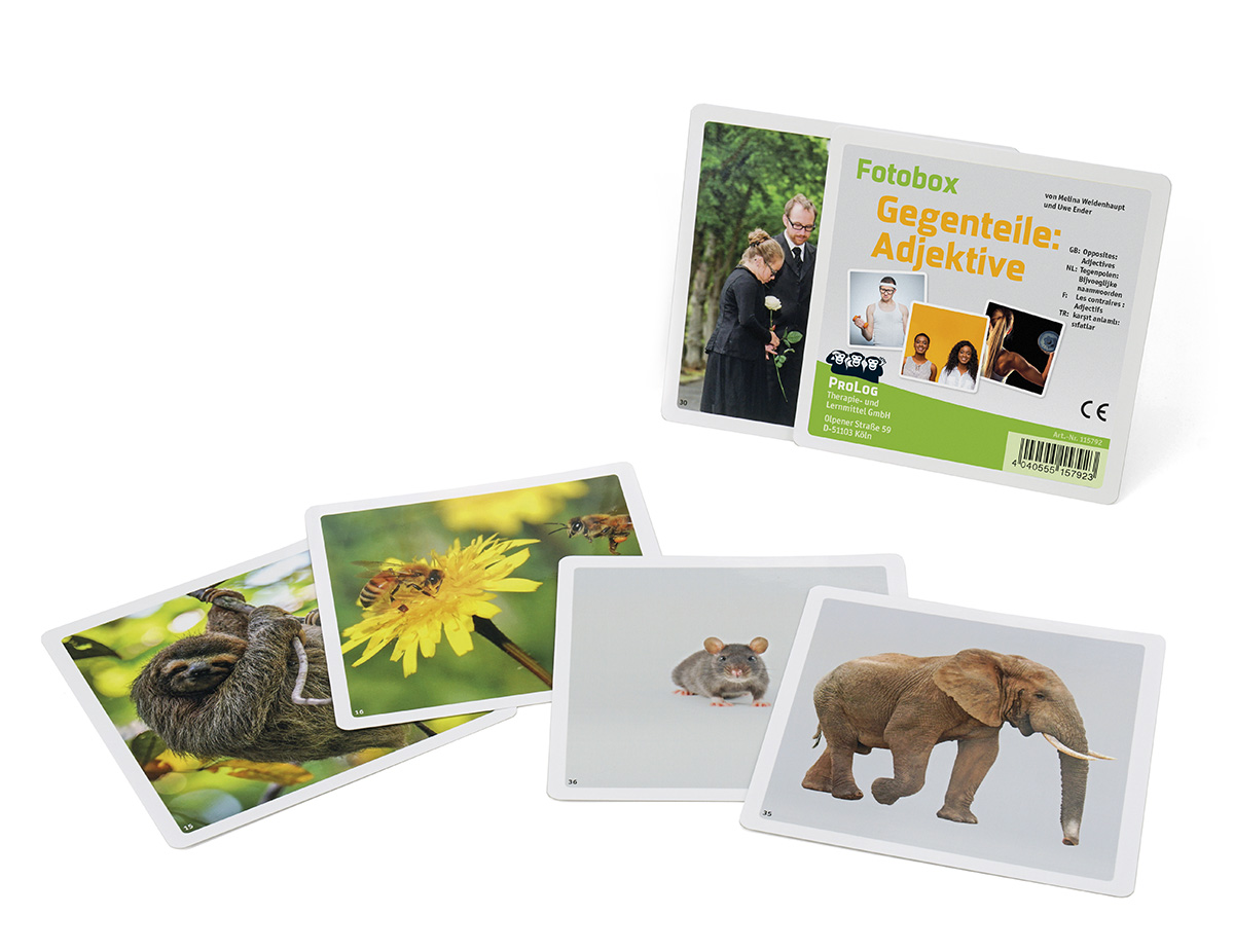Hier werden Eigenschaften und Merkmale in Form von Gegensätzen präsentiert. Da die Adjektive anhand von Fotos und somit an Menschen, Tieren und Gegenständen dargestellt werden, können die Items für diesen spezifischen semantischen Bereich besonders alltagsnah angeboten und deren Benennung erfragt werden. Auf 36 farbigen Fotokarten sind verschiedenste Inhalte abgebildet, die im Rahmen der Aphasie- bzw. Wortschatztherapie bspw. für Benenn- und Wortabrufsübungen vielseitig genutzt werden können.