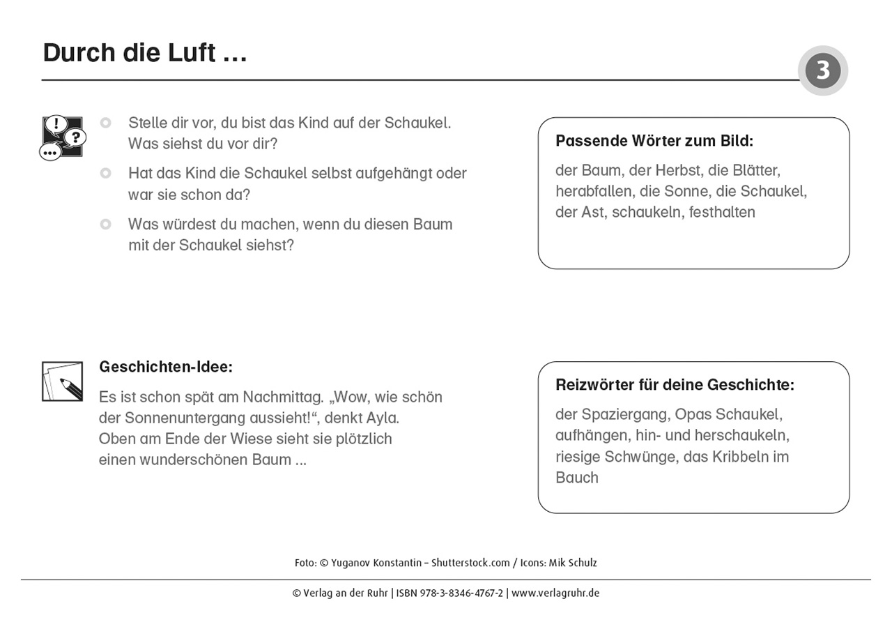 Bd 1: „Ein Bild sagt mehr als tausend Worte“, heißt es. Diese Kartei folgt vielmehr dem Motto: „Ein Bild ist Anlass für viele Worte!“ 80 wiederverwendbare Bildkarten regen zum Schreiben und Erzählen an. Von „Unterwasserwelt“ über „Länder und Kulturen“ bis hin zu „Kuriosem“ und „Magischem“ sind Bilder zu verschiedensten Themen vorhanden.