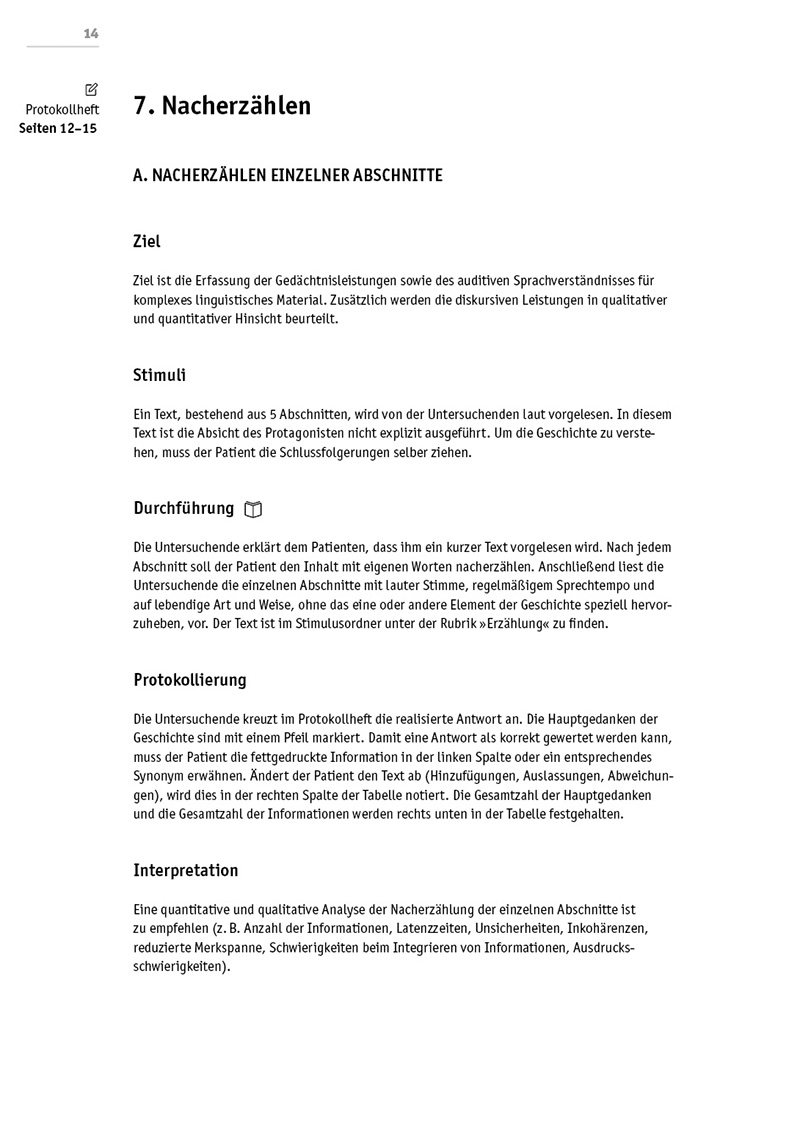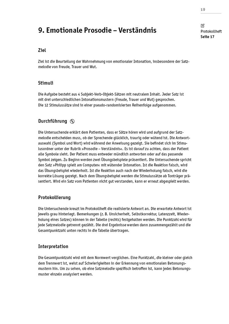 Kommunikationsstörungen, die durch Läsionen der rechten Hirnhälfte verursacht werden, sind oft subtil und nur schwer einzuschätzen, führen aber gleichwohl zu schwerwiegenden Beeinträchtigungen der Verständigung auf diskursiv-pragmatischer Ebene. Bislang und mit den herkömmlichen Aphasietestungen waren diese speziellen funktionellen Störungsformen nicht hinreichend aufzuspüren und einzuschätzen. Diese Lücke schließt nun das MEC Testverfahren. Es testet so zentrale Parameter wie linguistische und emotionale Prosodie (rezeptiv, expressiv und im Nachsprechen), lexikalisch-semantische Defizite (Wortflüssigkeit, semantisches Entscheiden, Metaphernverständnis), diskursive Beeinträchtigungen (in Gespräch und Erzählung) und pragmatische Störungen (Verstehen von unkonventionellen indirekten Sprechakten und Metaphern in Gesprächskontexten) sowie nichtsprachliche kognitive Defizite (z.B. mangelndes Störungsbewusstsein). In einem Anhang werden die Normierungskriterien erläutert.