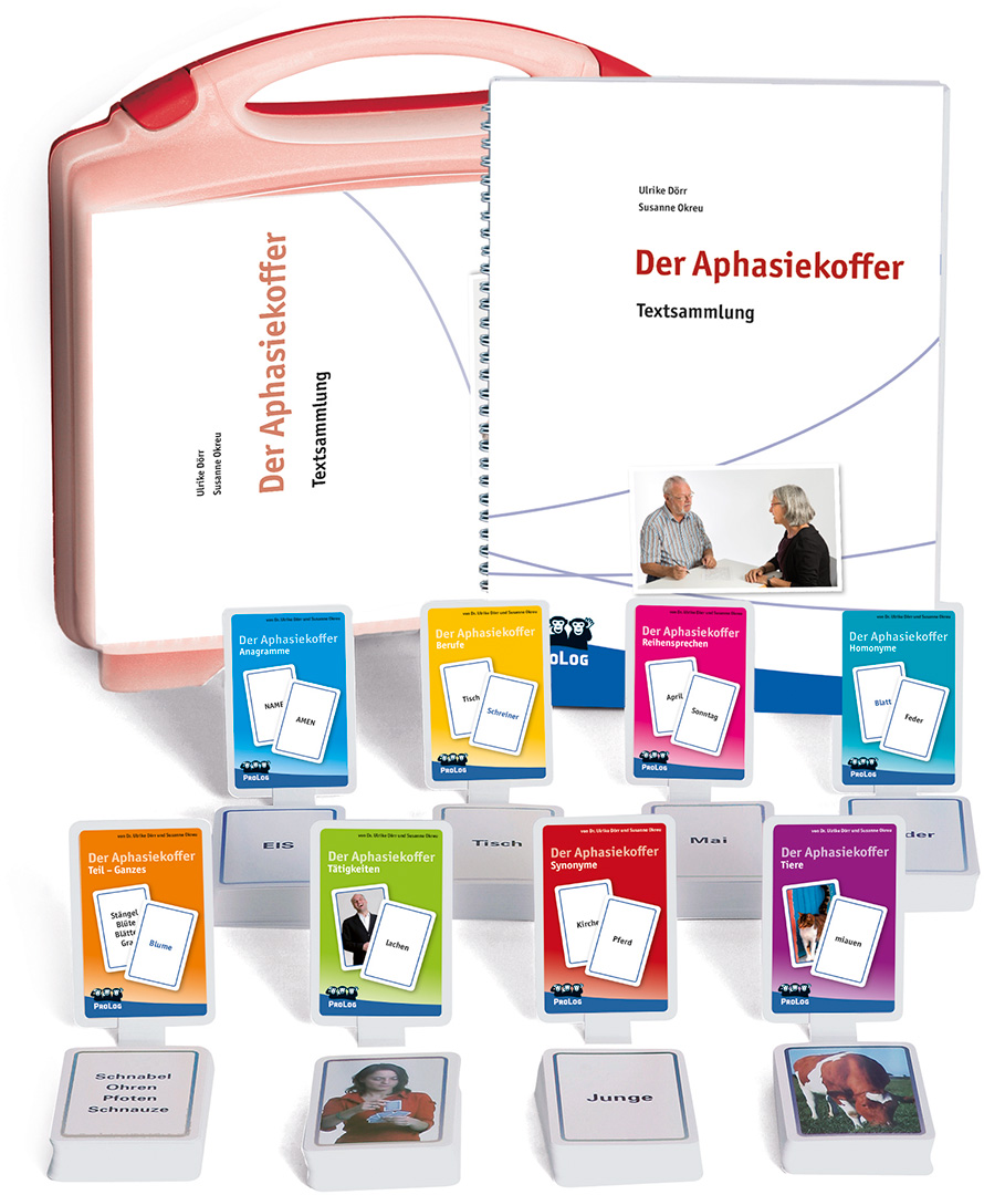 Der Aphasiekoffer hat’s in sich: Hier findet die Therapeutin alles, was für eine fundierte Aphasietherapie „aus dem Stand heraus” benötigt wird. Ein rascher Griff auf dem Weg ins Therapiezimmer oder beim Aufbruch zu einem Hausbesuch - und schon hat man das Nötigste dabei. Er beinhaltet abwechslungsreiche therapeutische Möglichkeiten für die Einzel- und Gruppentherapie bei Aphasien jedes Schweregrades. Alles im handlichen Plastikkoffer!