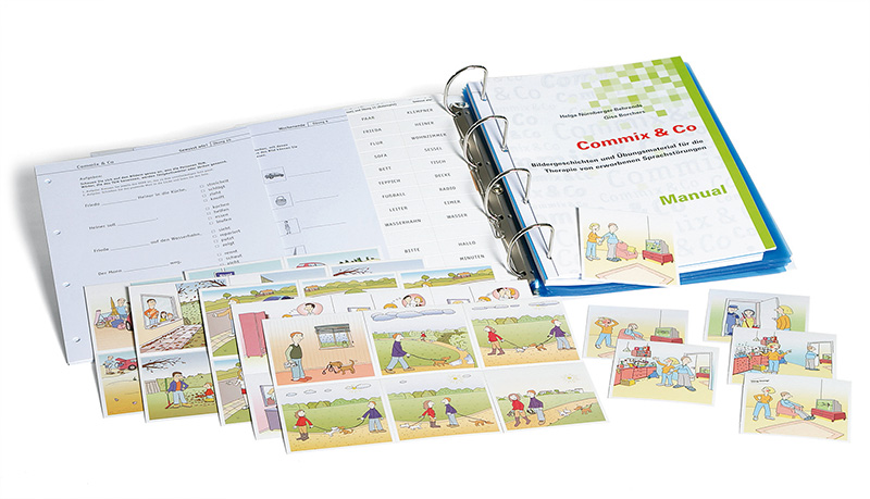 "Commix & Co" ist ein erwachsenengerechtes und alltagsorientiertes Übungsmaterial für Patienten mit mittelschweren bis schweren Störungen der Sprache. Es richtet sich in Wortschatz, Satzbau und kommunikativen Trainingszielen an den Bedürfnissen von Aphasikern aus und dient - ausgehend von überschaubaren Bildergeschichten - der multimodalen (laut- und schriftsprachlichen) Erarbeitung von Wörtern, Sätzen und Texten. Die Bildergeschichten behandeln Rollenkonflikte und Vorurteile, die gegen Ende in einer witzigen Pointe "aufgelöst" werden.