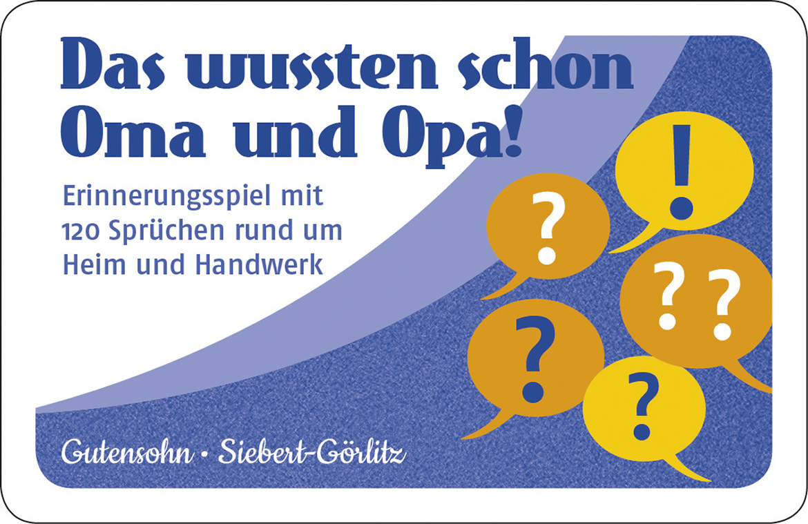 Sie sind unvergesslich und begleiten uns ein Leben lang: Omas Küchensprüche und Opas Handwerksregeln. Gerade bei älteren Menschen sind viele tief im Altgedächtnis verankert und können oft nahezu automatisch ergänzt werden, wenn der Anfang der Sprüche vorgelesen wird. Dieses Ergänzungsspiel umfasst 120 Frage-Antwort-Karten zum Rätseln und Erinnern. Zwei Schwierigkeitsgrade erlauben, das Spiel individuell angepasst einzusetzen, so dass es sich auch für Menschen mit dementieller Beeinträchtigung eignet. Im Zentrum steht immer das gemeinsame Erlebnis, miteinander lachen, ins Gespräch kommen und altes Wissen wieder aufleben lassen.
