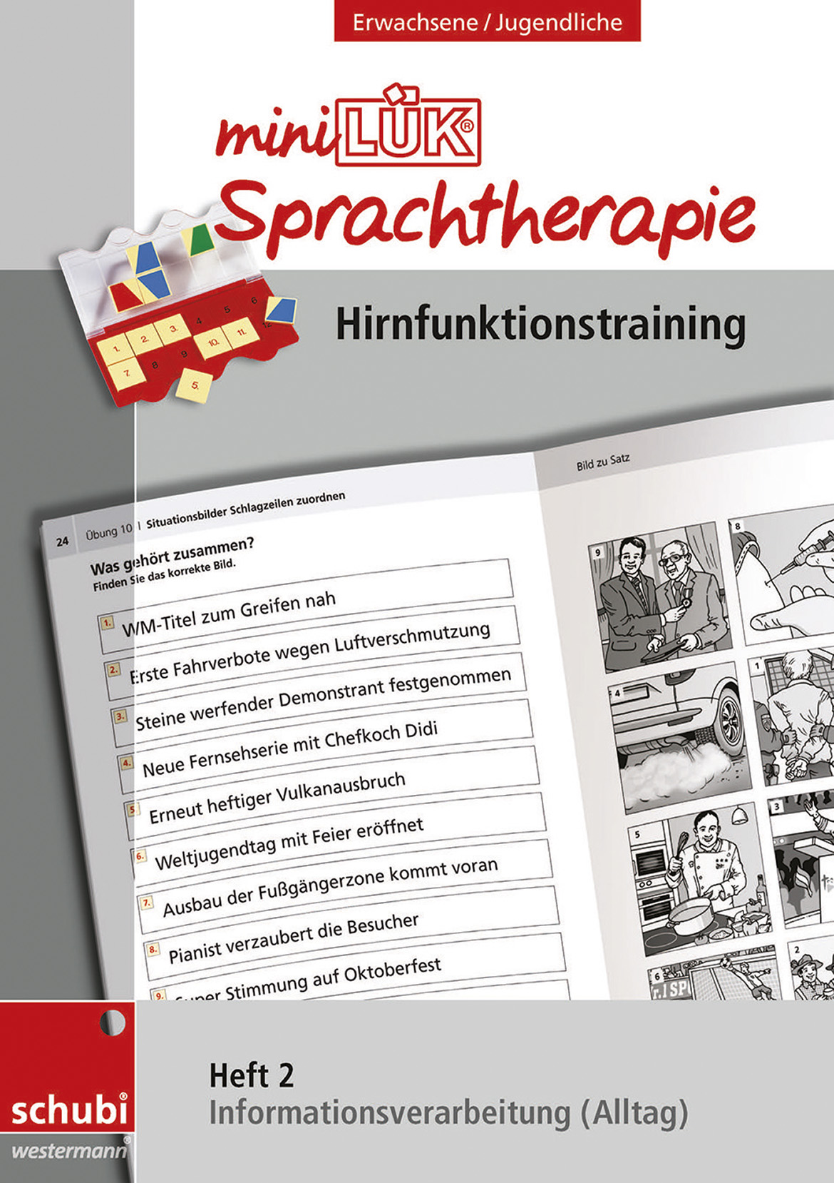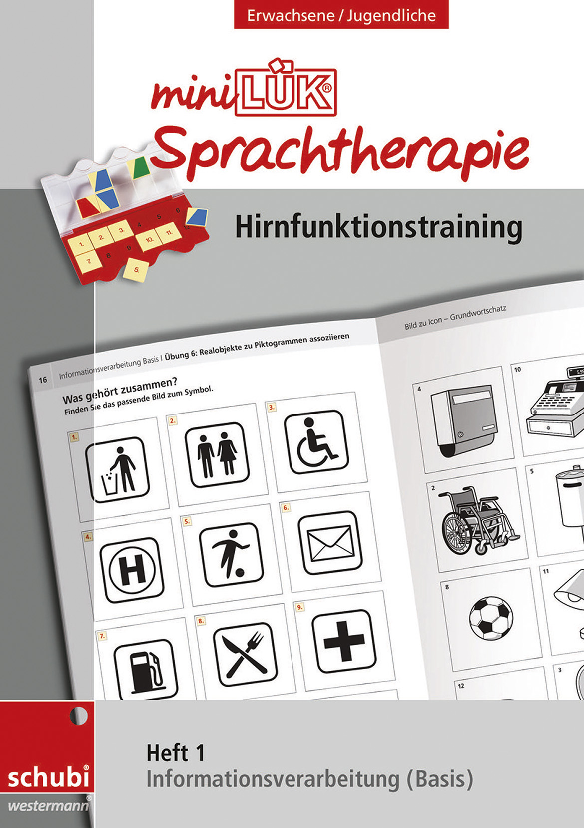 Kognition, Gedächtnis, Wahrnehmung, Orientierung, Konzentration, Aufmerksamkeit, exekutive Funktionen und Affektkontrolle haben sprachunterstützende Funktion. Die Arbeitshefte der Reihe ‚miniLÜK® Sprachtherapie Hirnfunktionstraining‘ können in der logopädischen Therapie mit Erwachsenen und Jugendlichen mit Aphasie, Dysarthrie, oder kognitiver Dysphasie eingesetzt werden.