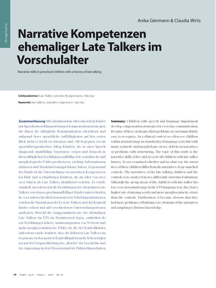 Dieser Artikel wurde in der Fachzeitschrift Logos veröffentlicht. Ausgabe 1/2013 DOI-Nr. 10.7345/prolog-1301028 Der gewählte Artikel wird Ihnen nach Ihrer Bestellung in unserem Shop, nach Prüfung der Bestellung, als PDF-Datei zusammen mit der Online-Rechnung per E-Mail zugestellt. Mit dem elektronischen Absenden ist Ihre Bestellung verbindlich, ein Umtausch oder eine Rückgabe nicht mehr möglich. Zur Anzeige werden entsprechende Programme - wie z. B. der Acrobat Reader benötigt. Fachartikel sind urheberrechtlich geschütztes Material. Copyright: ProLog, Therapie- und Lernmittel OHG, Köln. Vervielfältigungen jeglicher Art nur nach schriftlicher Genehmigung des Verlags gegen Entgelt möglich.
