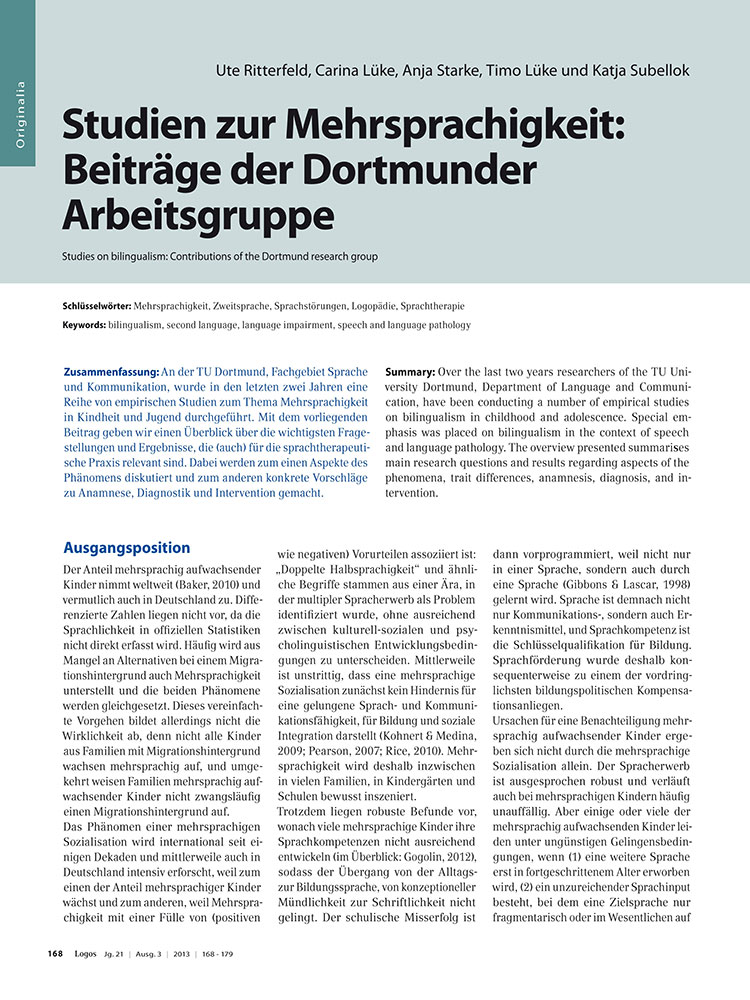 Over the last two years researchers of the TU University Dortmund, Department of Language and Communication, have been conducting a number of empirical studies on bilingualism in childhood and adolescence. Special emphasis was placed on bilingualism in the context of speech and language pathology. The overview presented summarises main research questions and results regarding aspects of the phenomena, trait differences, anamnesis, diagnosis, and intervention.