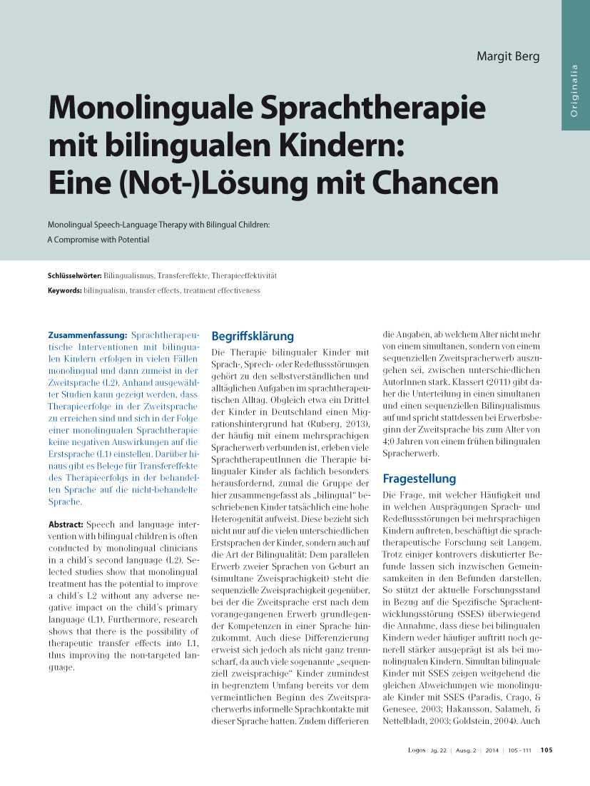 Dieser Artikel wurde in der Fachzeitschrift Logos veröffentlicht. Ausgabe 2/2014 DOI-Nr. 10.7345/prolog-1402109 Der gewählte Artikel wird Ihnen nach Ihrer Bestellung in unserem Shop, nach Prüfung der Bestellung, als PDF-Datei zusammen mit der Online-Rechnung per E-Mail zugestellt. Mit dem elektronischen Absenden ist Ihre Bestellung verbindlich, ein Umtausch oder eine Rückgabe nicht mehr möglich. Zur Anzeige werden entsprechende Programme - wie z. B. der Acrobat Reader benötigt. Fachartikel sind urheberrechtlich geschütztes Material. Copyright: ProLog, Therapie- und Lernmittel GmbH, Köln. Vervielfältigungen jeglicher Art nur nach schriftlicher Genehmigung des Verlags gegen Entgelt möglich.