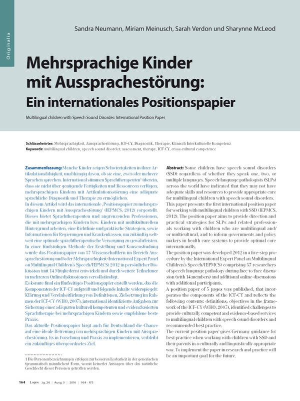 In diesem Artikel wird das internationale ‚Positionspapier zu mehrsprachigen Kindern mit Aussprachestörung‘ (IEPMCS, 2012) vorgestellt. Dieses bietet Sprachtherapeuten und angrenzenden Professionen, die mit mehrsprachigen Kindern bzw. Kindern mit multikulturellem Hintergrund arbeiten, eine Richtlinie und praktische Strategien, sowie Informationen für Regierungen und Krankenkassen, um zukünftig weltweit eine optimale sprachtherapeutische Versorgung zu gewährleisten.