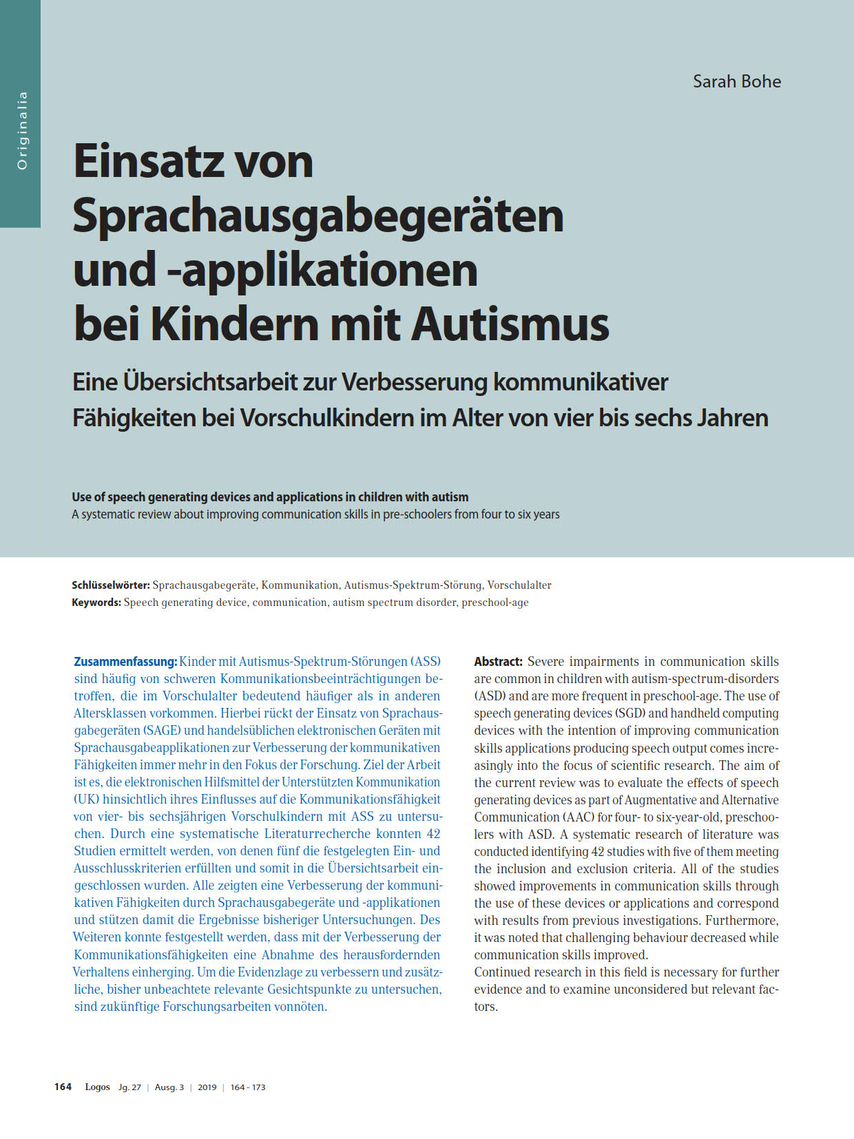 Dieser Artikel wurde in der Fachzeitschrift Logos veröffentlicht. Ausgabe 3/2019 DOI-Nr. 10.7345/prolog-1903164 Der gewählte Artikel wird Ihnen nach Ihrer Bestellung in unserem Shop, nach Prüfung der Bestellung, als PDF-Datei zusammen mit der Online-Rechnung per E-Mail zugestellt. Mit dem elektronischen Absenden ist Ihre Bestellung verbindlich, ein Umtausch oder eine Rückgabe nicht mehr möglich. Zur Anzeige werden entsprechende Programme - wie z. B. der Acrobat Reader benötigt. Fachartikel sind urheberrechtlich geschütztes Material. Copyright: ProLog, Therapie- und Lernmittel GmbH, Köln. Vervielfältigungen jeglicher Art nur nach schriftlicher Genehmigung des Verlags gegen Entgelt möglich.