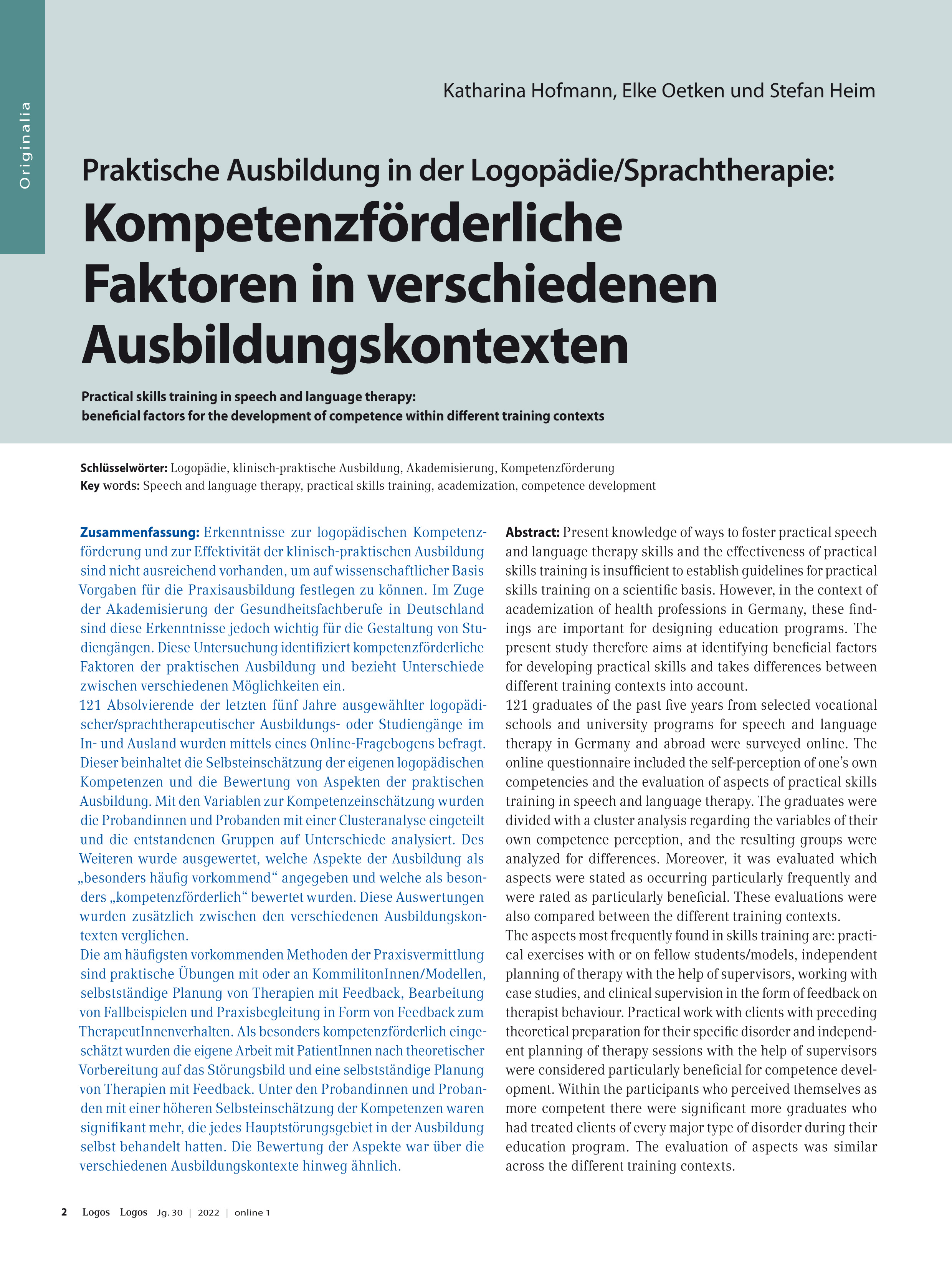 Schlüsselwörter: Logopädie, klinisch-praktische Ausbildung, Akademisierung, Kompetenzförderung