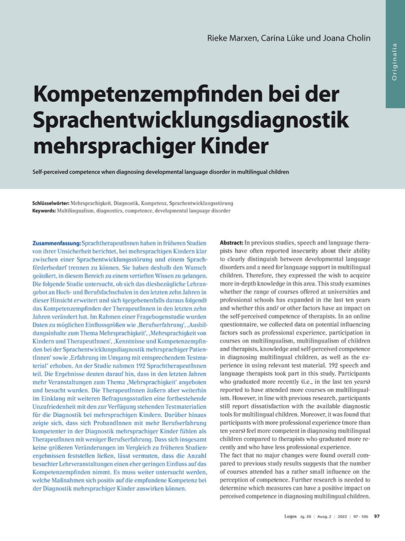 Dieser Artikel wurde in der Fachzeitschrift Logos veröffentlicht. Ausgabe 2/2022 DOI-Nr. 10.7345/prolog-2202097 Der gewählte Artikel wird Ihnen nach Ihrer Bestellung in unserem Shop, nach Prüfung der Bestellung, als PDF-Datei zusammen mit der Online-Rechnung per E-Mail zugestellt. Mit dem elektronischen Absenden ist Ihre Bestellung verbindlich, ein Umtausch oder eine Rückgabe nicht mehr möglich. Zur Anzeige werden entsprechende Programme - wie z. B. der Acrobat Reader benötigt. Fachartikel sind urheberrechtlich geschütztes Material. Copyright: ProLog, Therapie- und Lernmittel GmbH, Köln. Vervielfältigungen jeglicher Art nur nach schriftlicher Genehmigung des Verlags gegen Entgelt möglich.