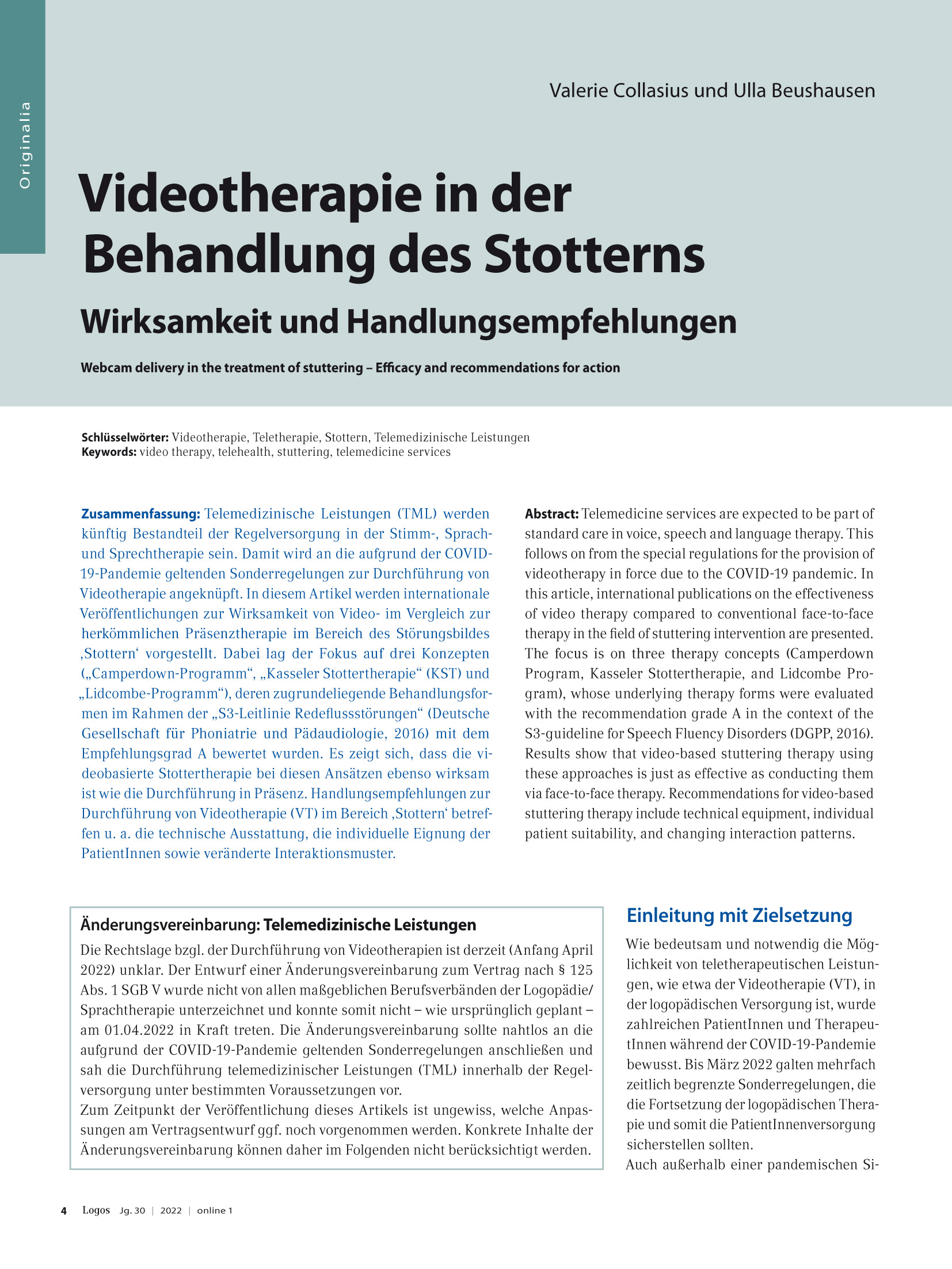 Dieser Artikel wurde in der Fachzeitschrift Logos veröffentlicht. Ausgabe 3/2022 DOI-Nr. 10.7345/prolog-2203164 Der gewählte Artikel wird Ihnen nach Ihrer Bestellung in unserem Shop, nach Prüfung der Bestellung, als PDF-Datei zusammen mit der Online-Rechnung per E-Mail zugestellt. Mit dem elektronischen Absenden ist Ihre Bestellung verbindlich, ein Umtausch oder eine Rückgabe nicht mehr möglich. Zur Anzeige werden entsprechende Programme - wie z. B. der Acrobat Reader benötigt. Fachartikel sind urheberrechtlich geschütztes Material. Copyright: ProLog, Therapie- und Lernmittel GmbH, Köln. Vervielfältigungen jeglicher Art nur nach schriftlicher Genehmigung des Verlags gegen Entgelt möglich.