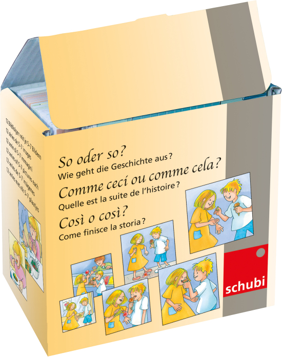 12 farbige Bildergeschichten beschreiben alltägliche, aber auch spannende Geschichten und haben je zwei Lösungsmöglichkeiten (blau oder rot) zur Auswahl. Ob die Geschichte „so“ oder „so“ ausgeht, entscheiden die kleinen Erzähler durch ihre eigene Interpretation. Die Geschichten eignen sich besonders zur Unterstützung der Kinder im freien Sprechen und Erzählen vor der Gruppe. Sie trainieren wichtige sprachliche Basisfunktionen wie das Erfassen und Nachvollziehen von Handlungsabläufen, das Erkennen zeitlicher Abfolgen und das Formulieren von Beobachtungen und Gefühlen.