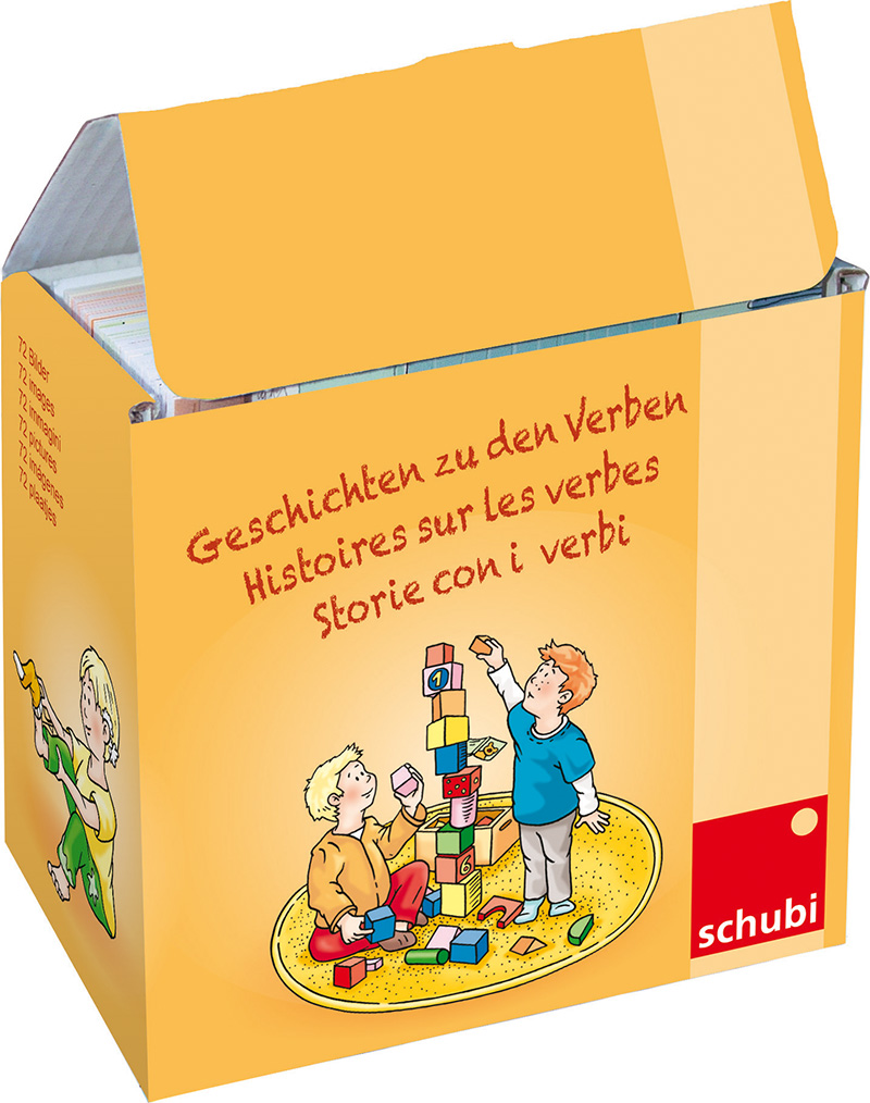 Jede der 18 Geschichten besteht aus vier Karten, auf denen jeweils ein bestimmtes Verb aus dem täglichen Sprachgebrauch im Mittelpunkt steht. Dieses Verb ist auf der jeweiligen Karte mit einem Zielsatz verknüpft. Die Zielsätze wiederum sind in eine Alltagsszene eingebettet. Mit den Geschichten können also zum einen 72 Verben aus dem Grundwortschatz wie z.B. sitzen, liegen, backen, schmecken, streiten, laufen und viele andere gezielt geübt werden, andererseits können die Geschichten, sobald die Verben bekannt sind, frei erzählt werden. Durch geschicktes Nachfragen kann das Kind beim Finden des Zielverbs (oder eines entsprechenden Synonyms) unterstützt werden. Beim Erzählen und Beschreiben lassen sich auf jeder Bildkarte weitere Tätigkeiten erkennen, zu denen die Kinder Verben finden können.
