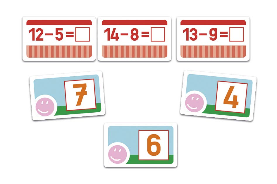 Hier wird die Grundrechenart Subtraktion gefestigt. Spielerisch werden Minusaufgaben gelöst, Zahlenwerte verglichen und in absteigender Reihenfolge sortiert. Daneben fördert das Spiel die Wahrnehmung und die Konzentration. Mit Selbstkontrolle!