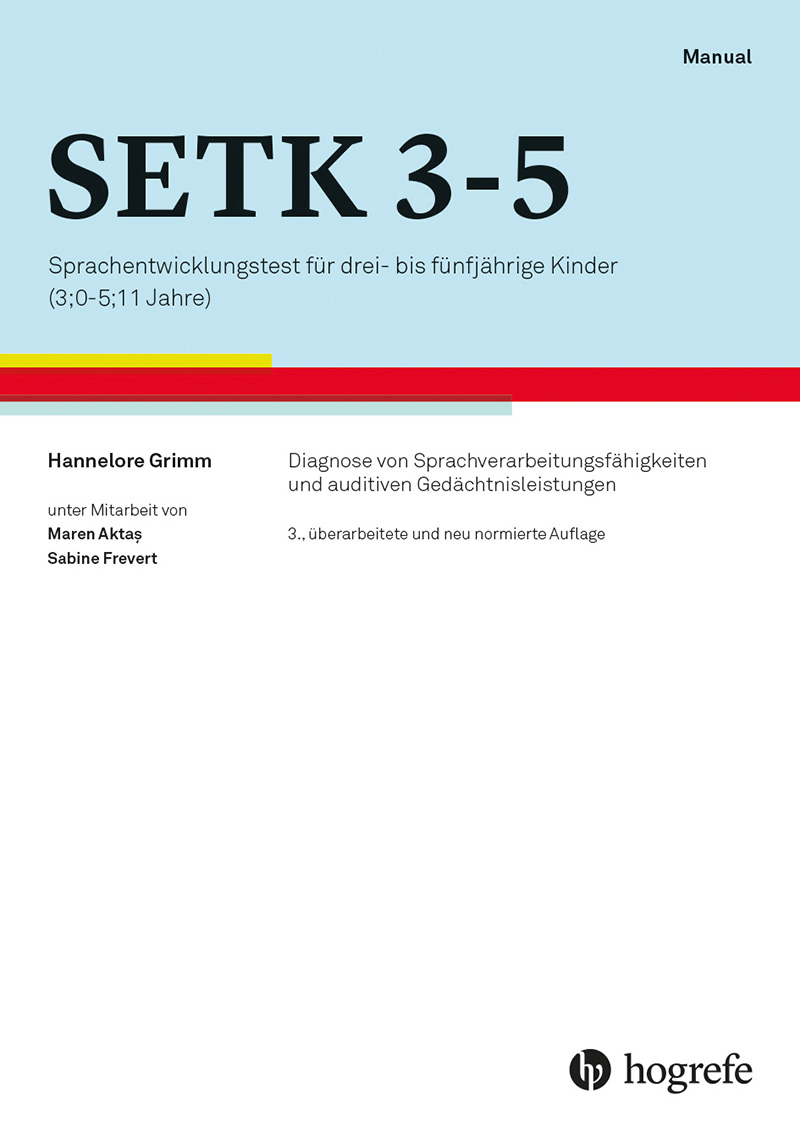 Der SETK 3-5 erfasst mit vier Untertests bei den dreijährigen Kindern und mit fünf Untertests bei den vier- bis fünfjährigen Kindern rezeptive und produktive Sprachverarbeitungsfähigkeiten sowie auditive Gedächtnisleistungen. Mit dem SETK 3-5 ist es möglich, im kritischen Altersbereich zwischen drei und fünf Jahren valide und reliabel das erreichte Sprachentwicklungsniveau festzustellen und in einen kausalen Erklärungszusammenhang mit auditiven Gedächtnisleistungen zu bringen. Dabei spielt das phonologische Arbeitsgedächtnis für Nichtwörter eine ganz entscheidende Rolle. Mit dieser dritten Auflage wird eine vollständige Neunormierung des SETK 3-5 vorgelegt. Weiterhin wurde das Manual inhaltlich ergänzt und auf der Grundlage aktueller Forschungsergebnisse auf den neuesten Stand gebracht. Die Testdurchführung und die Auswertung wurden um wichtige Ergänzungen und ganz konkrete Hilfestellungen erweitert. Sprachtherapeutische Fragestellungen können jetzt noch differenzierter beantwortet und Sprachförderpläne auf eine breitere Basis gestellt werden. Im Kapitel „Häufig gestellte Fragen“ wurden zahlreiche Fragestellungen und Anregungen aus der Praxis berücksichtigt. Die Einsatzmöglichkeiten des SETK 3-5 bei Kindern mit Deutsch als Zweitsprache (DaZ) haben ebenfalls eine Ergänzung erfahren.