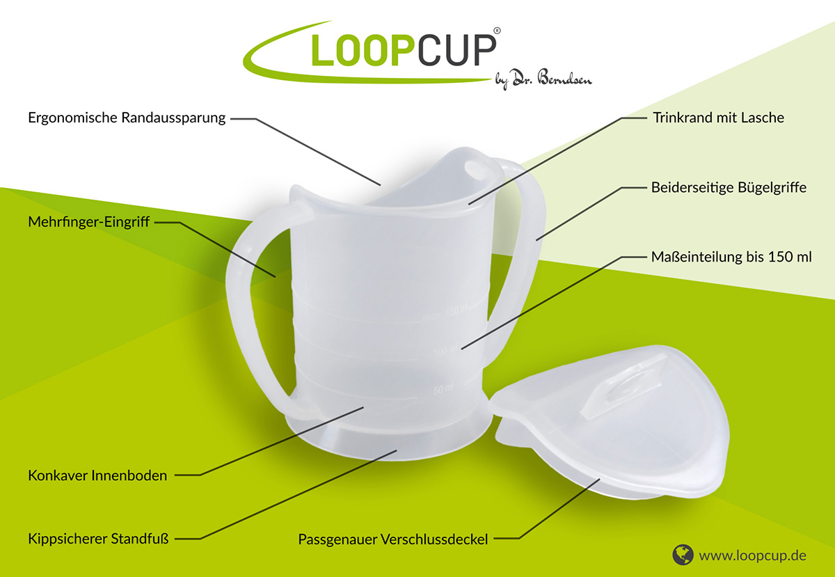 Trinkgefäße sollen prinzipiell besondere Anforderungen erfüllen. Sie müssen so beschaffen sein, dass das Trinken dem normalen Trinkvorgang optimal angepasst ist und diesen anregt. Andernfalls stellen sich falsche Funktionsmuster ein, die Probleme verursachen. Viele Hilfsmittel haben zwar Vorrichtungen, mit denen die Flüssigkeit in den Mund geführt wird (Schnabel, Nippel, Röhren etc.), die zum Trinken benötigten funktionellen Bewegungsmechanismen werden aber gerade dadurch gestört und die Trinkfunktion verschlechtert sich und die Flüssigkeit läuft aus dem Mund. Den Weg zum korrekten Trinken bahnt und unterstützt der LoopCup. Er wurde von den beiden Rehabilitationsspezialisten Dr. Klaus und Sabine Berndsen aus der praktischen Erfahrung entwickelt, um Trinkstörungen abzubauen und den Trinklernprozess anzuregen.