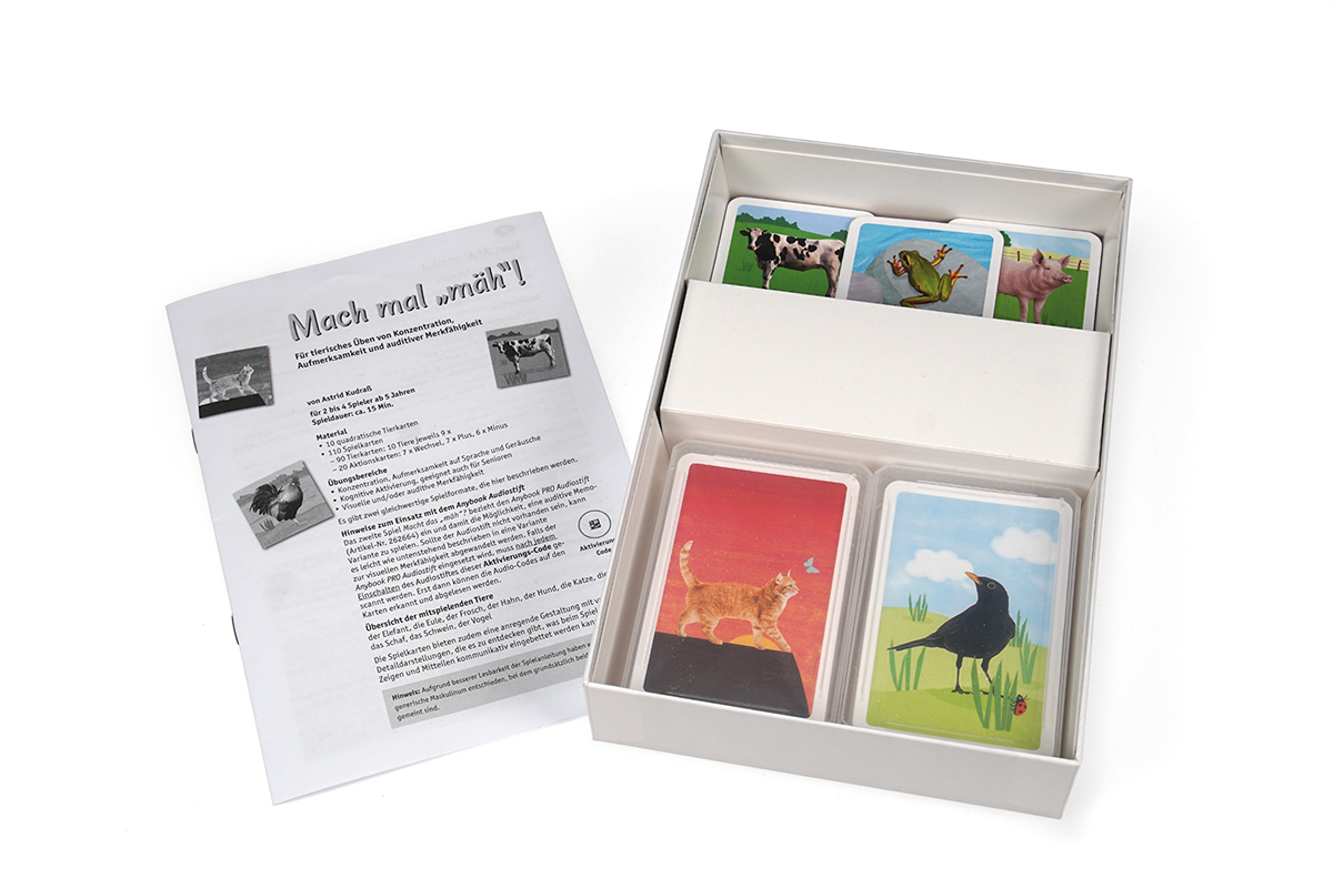 Mach mal „mäh“! bietet gleich zwei Spielformate, die das Üben der Aufmerksamkeit für Sprache und Geräusche sowie Konzentration und auditive Merkfähigkeit in runden Spielkonzepten ermöglichen: