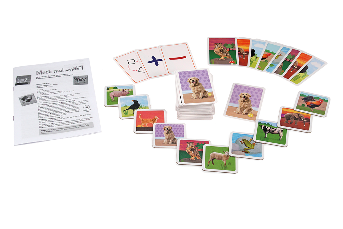 Mach mal „mäh“! bietet gleich zwei Spielformate, die das Üben der Aufmerksamkeit für Sprache und Geräusche sowie Konzentration und auditive Merkfähigkeit in runden Spielkonzepten ermöglichen: