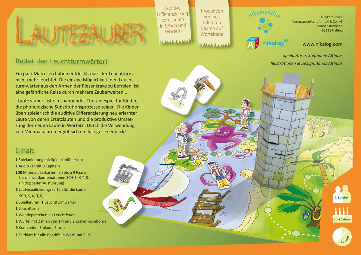 Im zweiten Teil des Spiels kommen die Minimalpaarkarten zum Einsatz: hier ist eine genaue Aussprache erforderlich, um die Rätsel zu lösen. Reimpaare suchen, Wörter finden, die den Ziellaut enthalten und Bildkarten richtig benennen gehört zu den Aufgaben der Zauberweltbewohner. Für jede richtig gelöste Herausforderung erhalten die Spieler eine der Karten mit dem Ziellaut, die später noch einmal benannt werden müssen, um den Leuchtturmwärter auf seinen Turm zurück zu bringen.